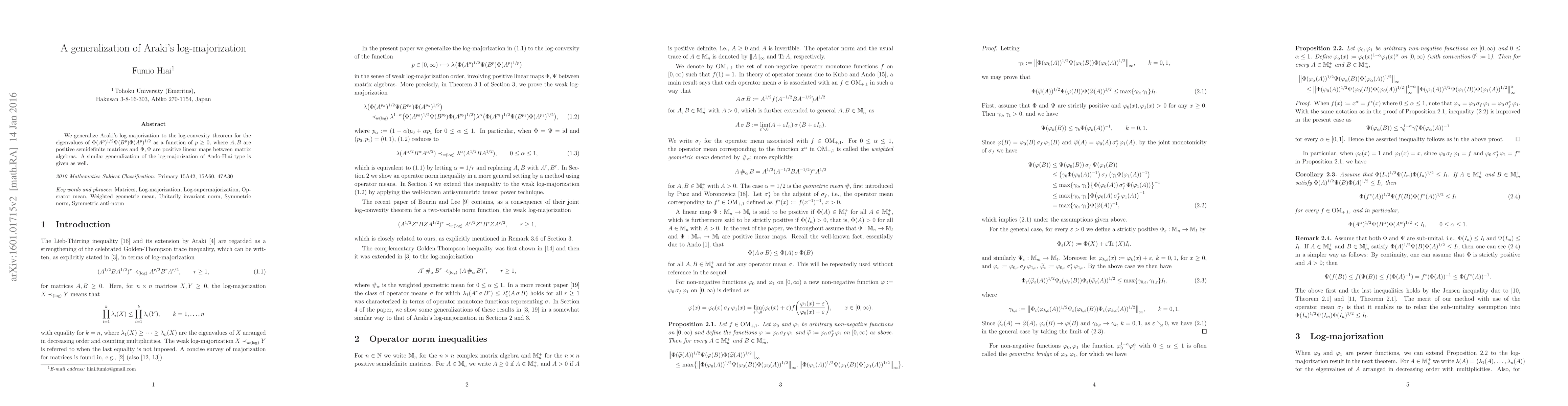 The paper introduces a generalized log-majorization theorem for eigenvalues of matrix products under positive linear maps and variable exponents, extending Araki's original log-majorization result.