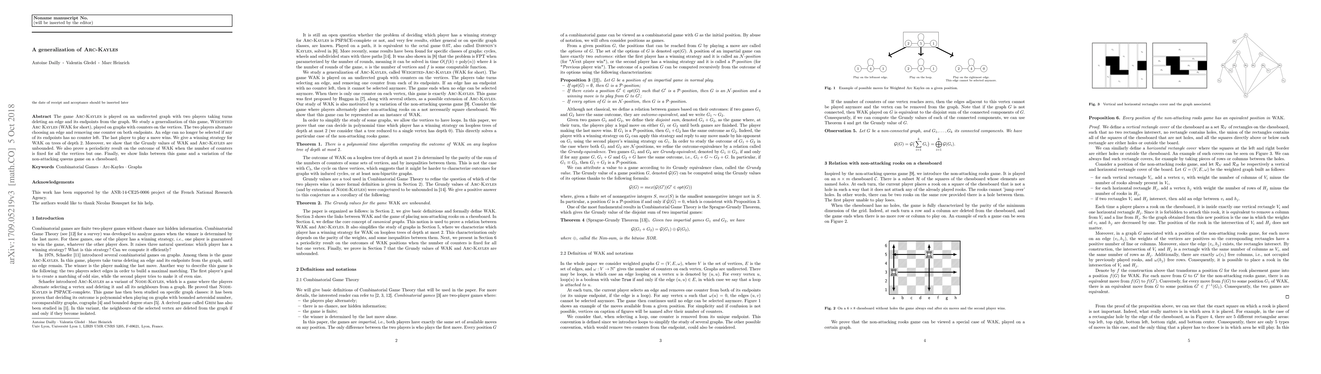 The game Arc-Kayles is played on an undirected graph with two players taking turns deleting an edge and its endpoints from the graph. We study a generalization of this game, Weighted Arc Kayles (WAK for short), played on graphs with counters on the vertices. The two players alternate choosing an edge and removing one counter on both endpoints. An edge can no longer be selected if any of its endpoints has no counter left. The last player to play a move wins. We give a winning strategy for WAK on trees of depth 2. Moreover, we show that the Grundy values of WAK and Arc-Kayles are unbounded. We also prove a periodicity result on the outcome of WAK when the number of counters is fixed for all the vertices but one. Finally, we show links between this game and a variation of the non-attacking queens game on a chessboard.