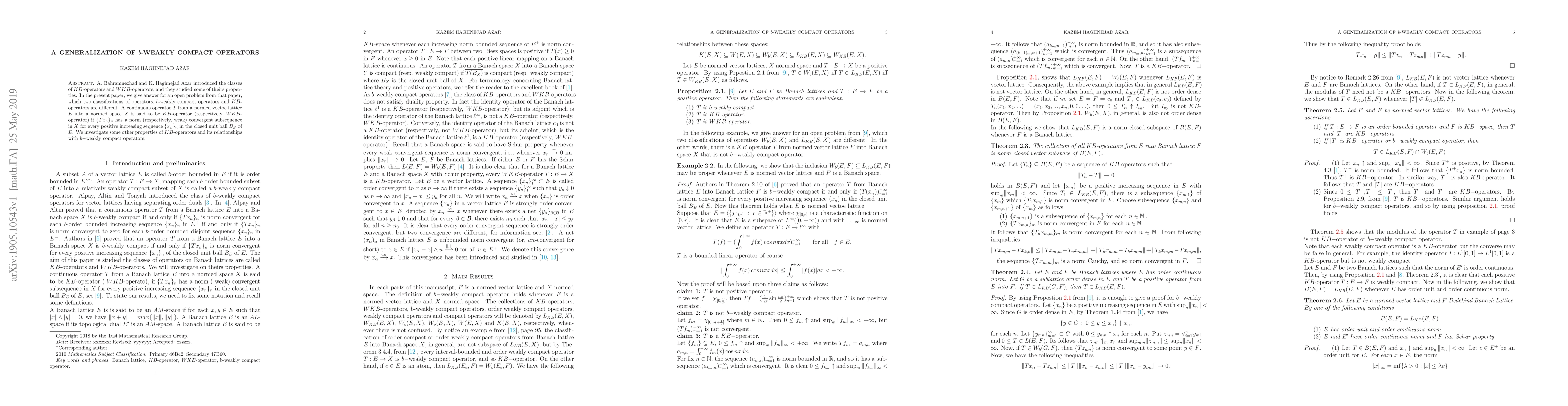 A. Bahramnezhad and K. Haghnejad Azar introduced the classes of $KB$-operators and $WKB$-operators, and they studied some of theirs properties. In the present paper, we give answer for an open problem from that paper, which two classifications of operators, $b$-weakly compact operators and $KB$-operators are different. A continuous operator $T$ from a normed vectoe lattice $E$ into a normed space $X$ is said to be $KB$-operator (respectively, $WKB$-operator) if $\{Tx_n\}_n$ has a norm (respectively, weak) convergent subsequence in $X$ for every positive increasing sequence $\{x_n\}_n$ in the closed unit ball $B_E$ of $E$. We investigate some other properties of $KB$-operators and its relationships with $b-$weakly compact operators.