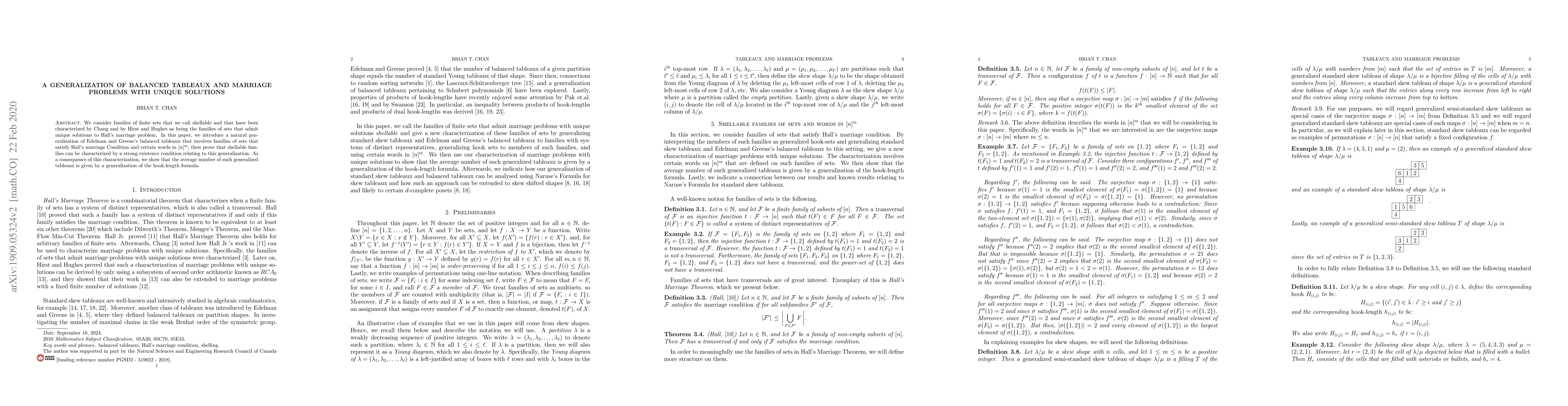 This paper generalizes balanced tableaux to families of sets that satisfy Hall's marriage condition, showing that shellable families can be characterized by a strong existence condition. It also derives a hook-length formula generalization for the average number of these generalized tableaux.
