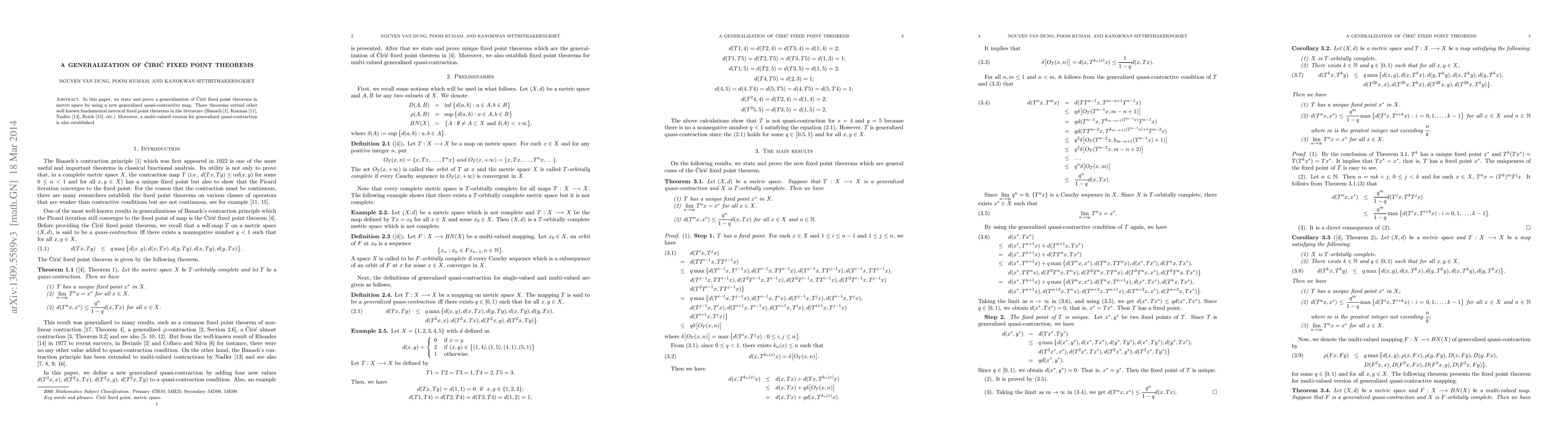 This paper generalizes Čiríc fixed point theorems in metric spaces using a new generalized quasi-contractive map, extending other fundamental metrical fixed point theorems. Additionally, a multi-valued version of the generalized quasi-contraction is introduced.