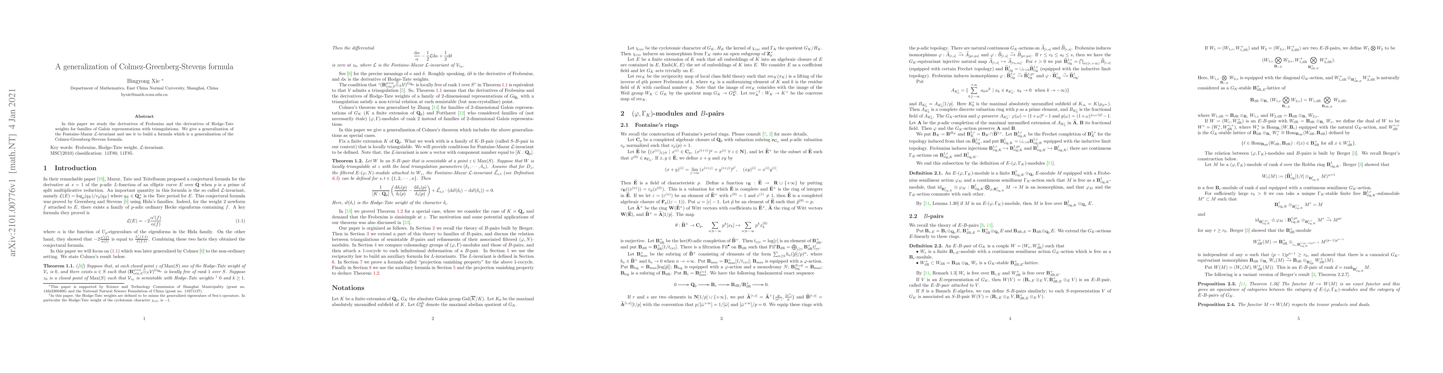 This research generalizes the Fontaine-Mazur L-invariant and derives a formula extending the Colmez-Greenberg-Stevens formula, applied to families of Galois representations with triangulations, focusing on derivatives of Frobenius and Hodge-Tate weights.