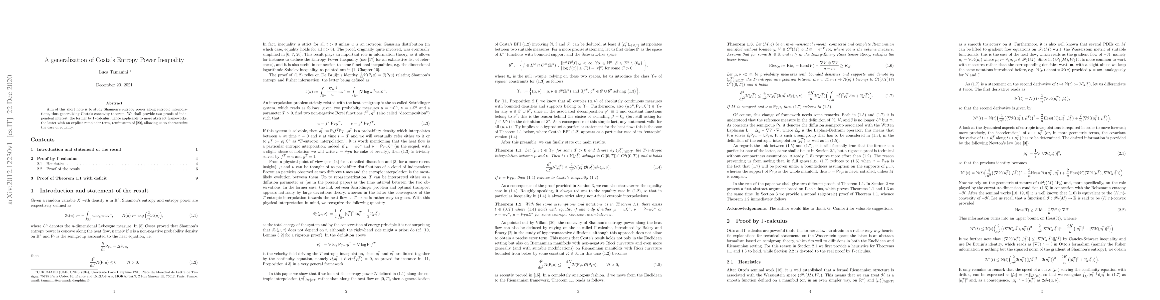 This paper generalizes Costa's Entropy Power Inequality by studying Shannon's entropy power through entropic interpolations. It provides two proofs: one using $\Gamma$-calculus for broader applicability and another with an explicit remainder term to characterize equality cases.