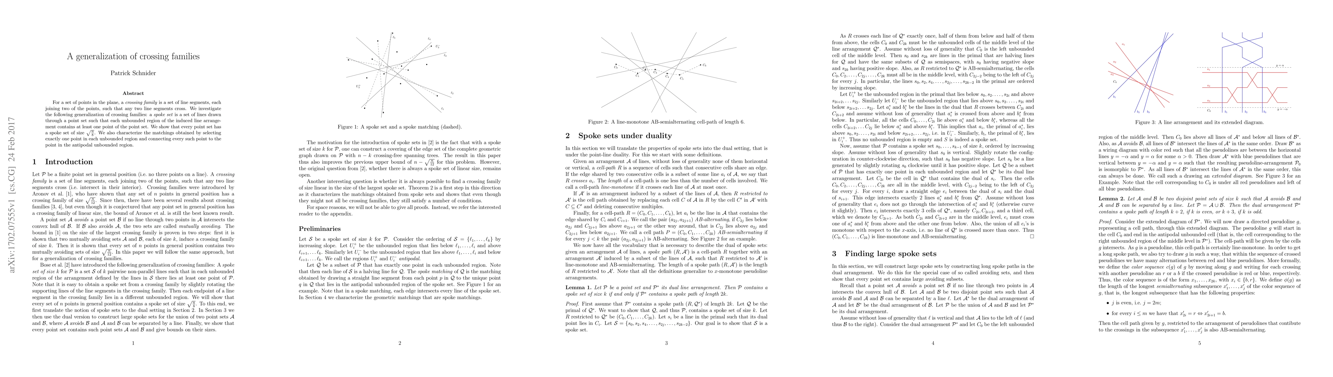 For a set of points in the plane, a \emph{crossing family} is a set of line segments, each joining two of the points, such that any two line segments cross. We investigate the following generalization of crossing families: a \emph{spoke set} is a set of lines drawn through a point set such that each unbounded region of the induced line arrangement contains at least one point of the point set. We show that every point set has a spoke set of size $\sqrt{\frac{n}{8}}$. We also characterize the matchings obtained by selecting exactly one point in each unbounded region and connecting every such point to the point in the antipodal unbounded region.