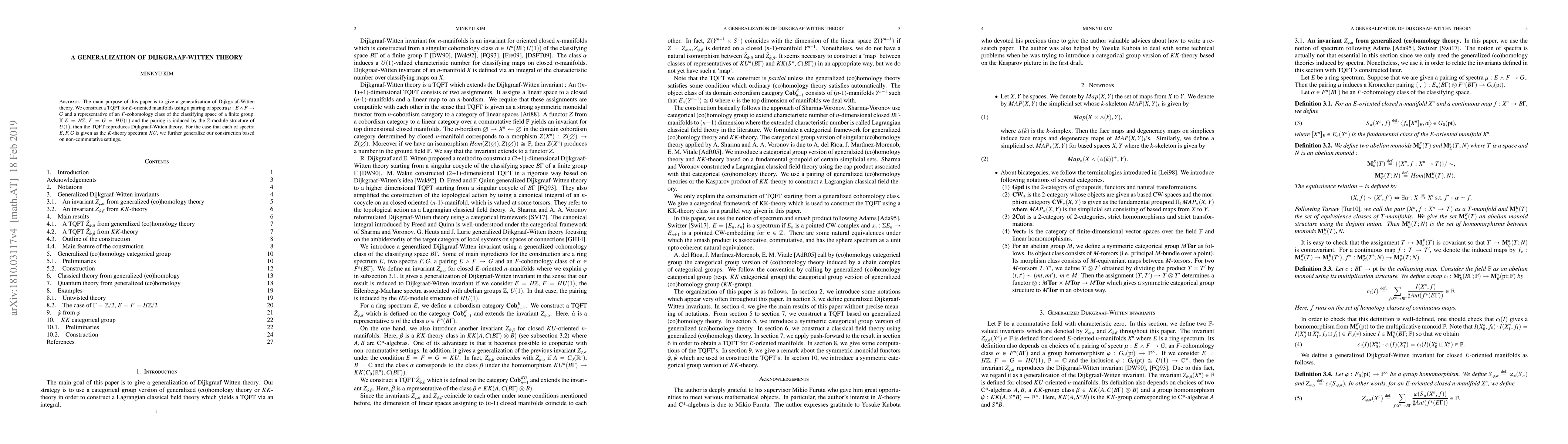 This paper generalizes Dijkgraaf-Witten theory by constructing a Topological Quantum Field Theory (TQFT) for E-oriented manifolds via a morphism from a smash product of spectra E,F to G, utilizing F-cohomology classes on the classifying space of a finite group. The generalization extends to non-commutative settings when E, F, and G are K-theory spectra.