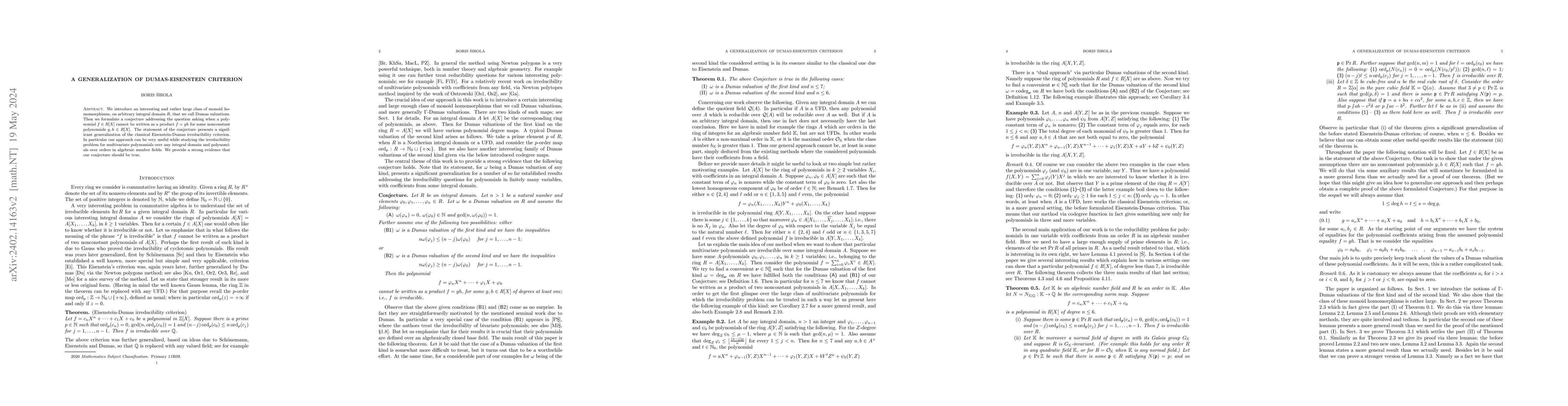 We introduce an interesting and rather large class of monoid homomorphisms, on arbitrary integral domain $R$, that we call Dumas valuations. Then we formulate a conjecture addressing the question asking when a polynomial $f\in R[X]$ cannot be written as a product $f=gh$ for some nonconstant polynomials $g,h\in R[X]$. The statement of the conjecture presents a significant generalization of the classical Eisenstein-Dumas irreducibility criterion. In particular our approach can be very useful while studying the irreducibility problem for multivariate polynomials over any integral domain and polynomials over orders in algebraic number fields. We provide a strong evidence that our conjecture should be true.