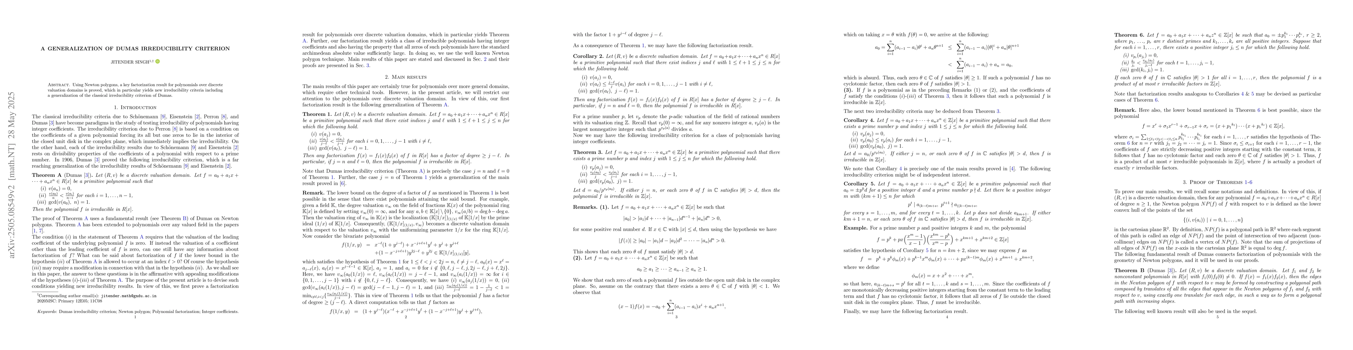 Researchers used Newton polygons to prove a generalization of Dumas' irreducibility criterion for polynomials over discrete valuation domains, providing new criteria for determining polynomial reducibility.