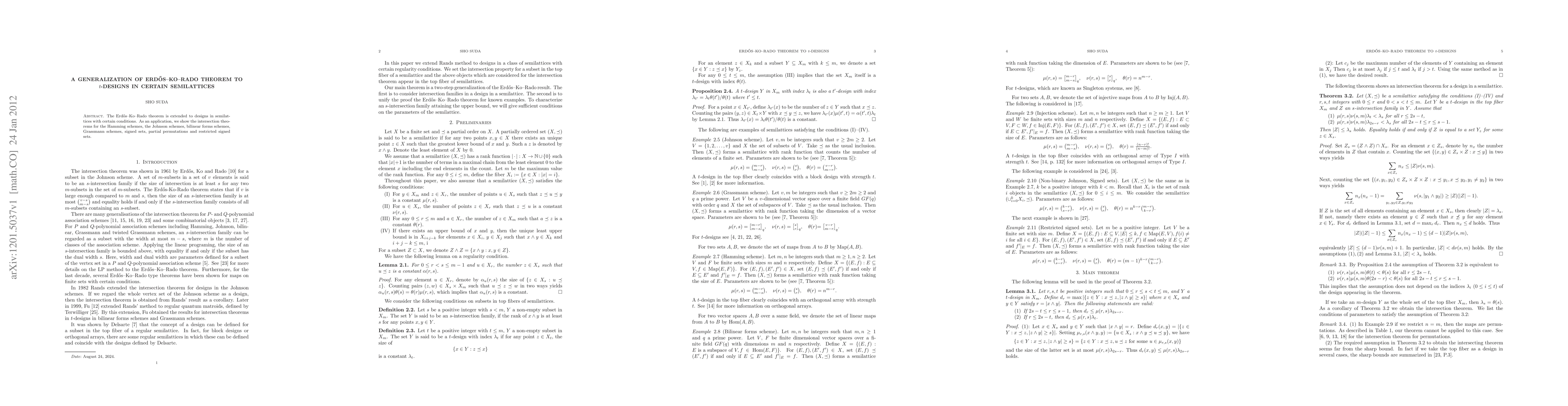 The paper generalizes the Erdős-Ko-Rado theorem to $t$-designs in specific semilattices, demonstrating applications to intersection theorems for various combinatorial structures including Hamming, Johnson, and Grassmann schemes.