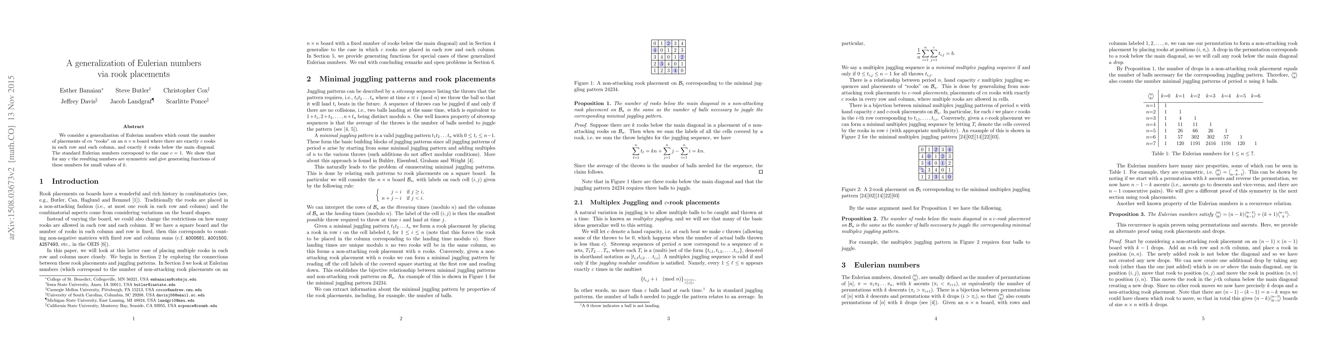 The paper introduces and studies generalized Eulerian numbers via rook placements, proving their symmetry and providing generating functions, along with bijective proofs linking rook placements to minimal multiplex juggling patterns.