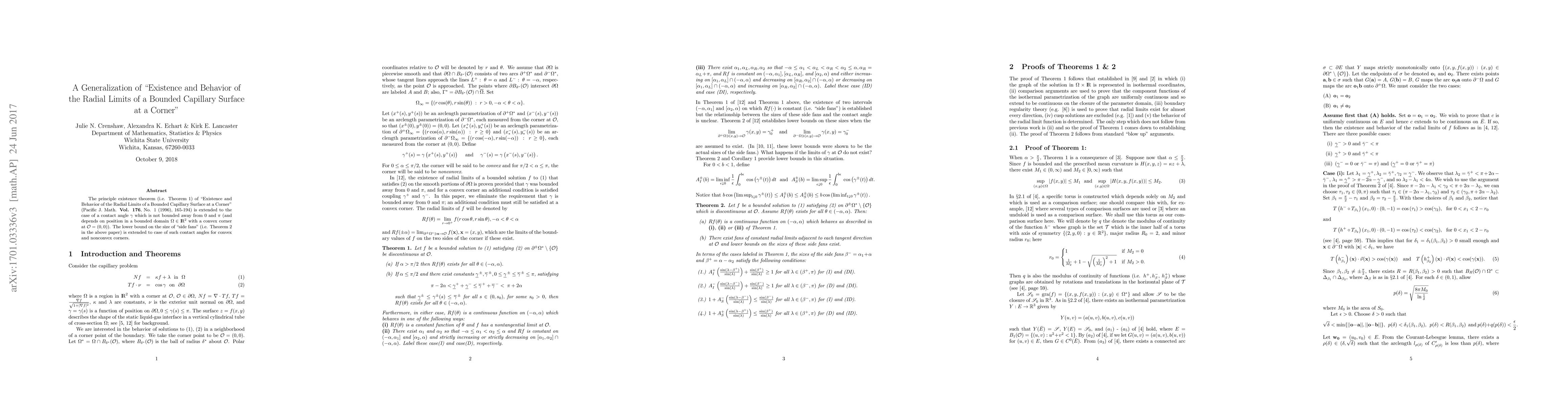 The principle existence theorem (i.e. Theorem 1) of "Existence and Behavior of the Radial Limits of a Bounded Capillary Surface at a Corner" (Pacific J. Math. Vol. 176, No. 1 (1996), 165-194) is extended to the case of a contact angle $\gamma$ which is not bounded away from $0$ and $\pi$ (and depends on position in a bounded domain $\Omega\in {\bf R}^{2}$ with a convex corner at ${\cal O}=(0,0)$). The lower bound on the size of "side fans" (i.e. Theorem 2 in the above paper) is extended to case of such contact angles for convex and nonconvex corners.