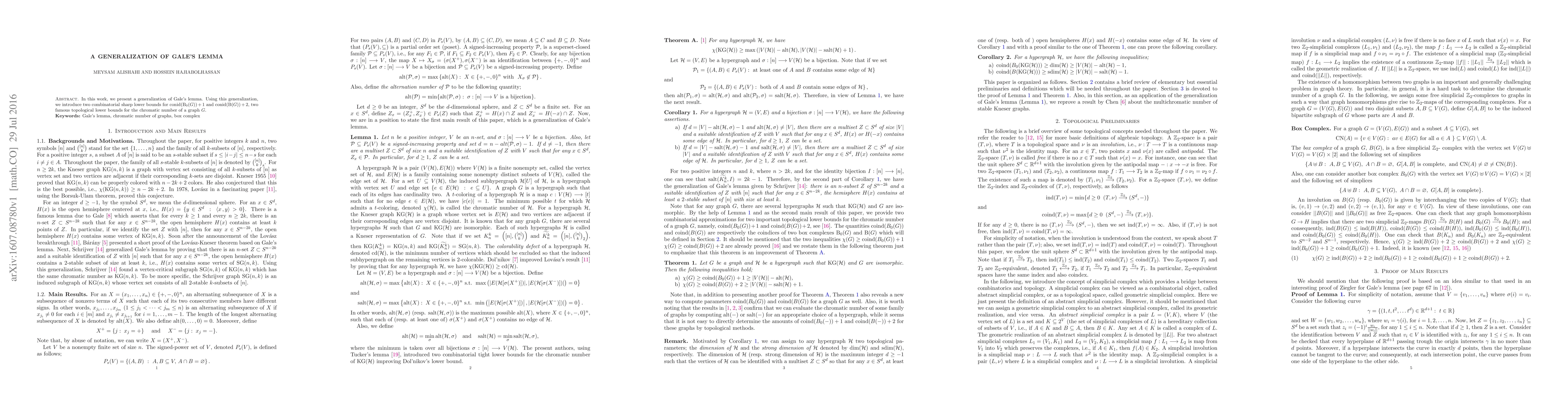 This paper generalizes Gale's lemma and utilizes the generalization to establish sharp lower bounds for two topological measures related to the chromatic number of a graph. The findings provide deeper insights into the combinatorial properties of graph coloring.