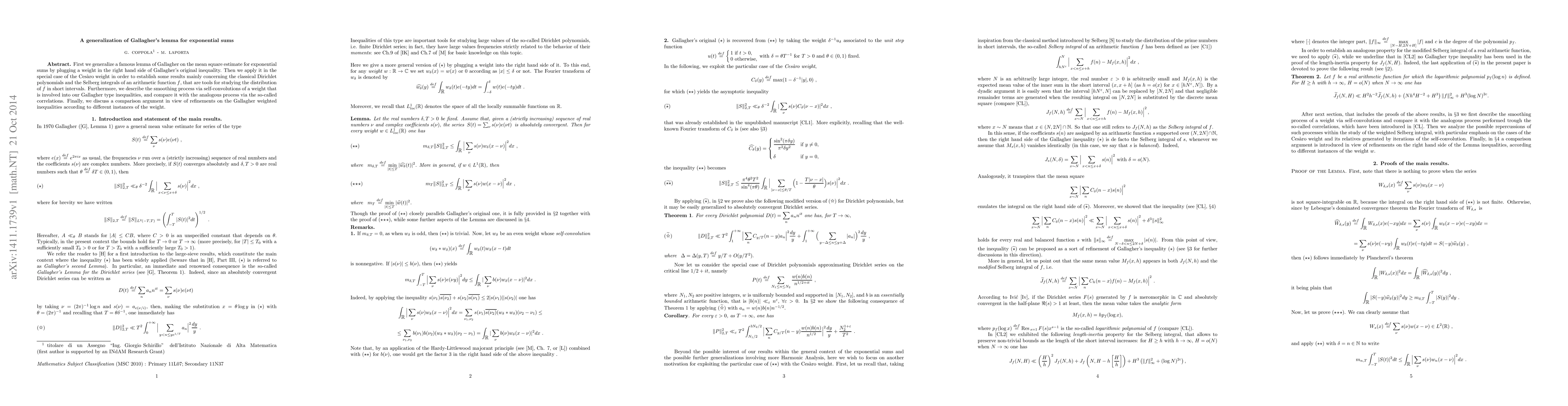 First we generalize a famous lemma of Gallagher on the mean square estimate for exponential sums by plugging a weight in the right hand side of Gallagher's original inequality. Then we apply it in the special case of the Cesaro weight, in order to establish some results mainly concerning the classical Dirichlet polynomials and the Selberg integrals of an arithmetic function $f$, that are tools for studying the distribution of $f$ in short intervals. Furthermore, we describe the smoothing process via self-convolutions of a weight, that is involved into our Gallagher type inequalities, and compare it with the analogous process via the so-called correlations. Finally, we discuss a comparison argument in view of refinements on the Gallagher weighted inequalities according to different instances of the weight.
