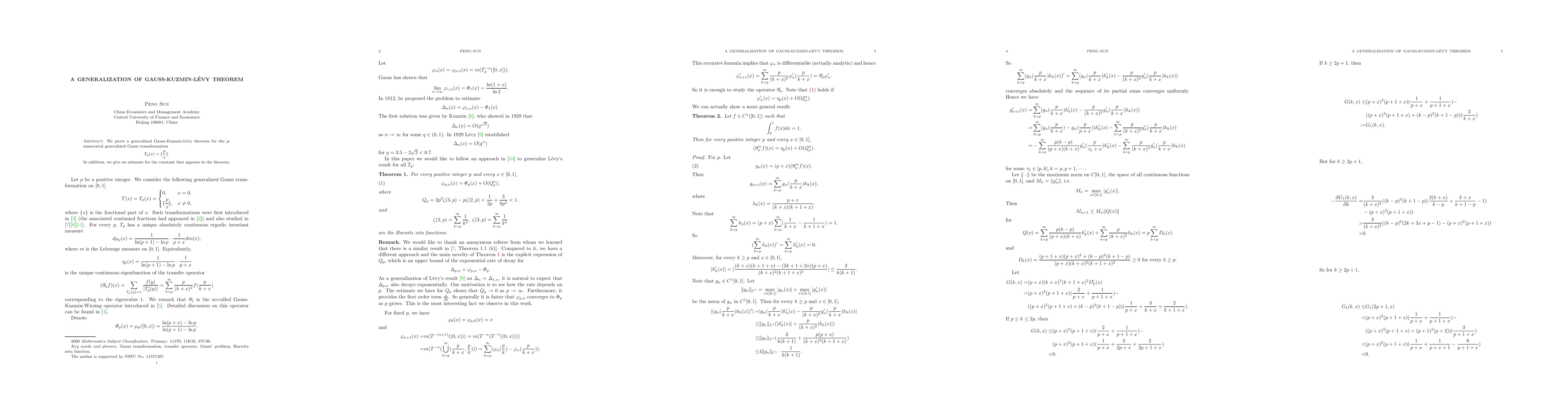 We prove a generalized Gauss-Kuzmin-L\'evy theorem for the $p$-numerated generalized Gauss transformation $$T_p(x)=\{\frac{p}{x}\}.$$ In addition, we give an estimate for the constant that appears in the theorem.