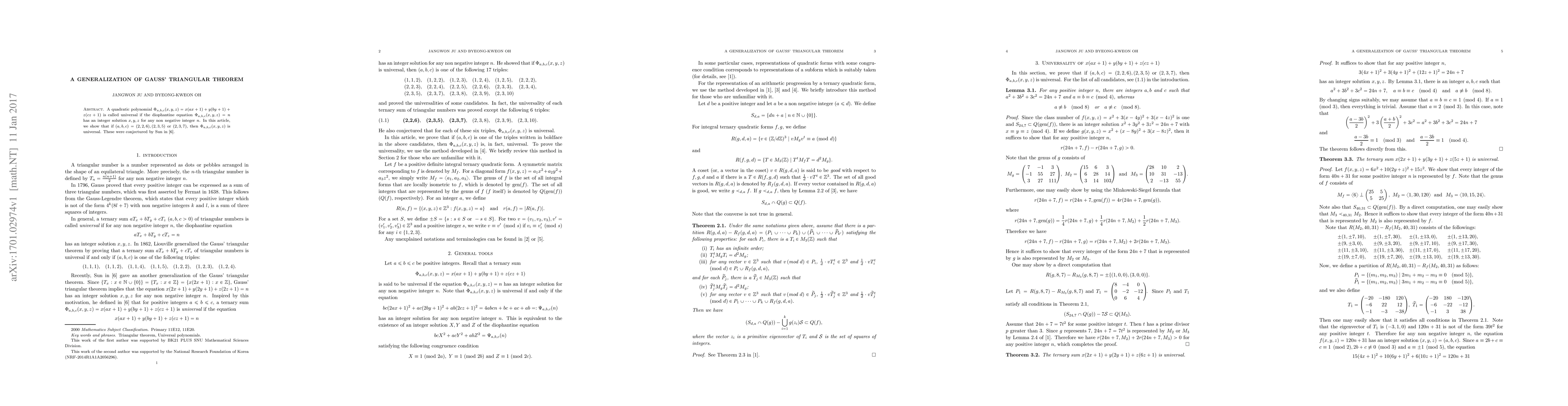 A quadratic polynomial $\Phi_{a,b,c}(x,y,z)=x(ax+1)+y(by+1)+z(cz+1)$ is called universal if the diophantine equation $\Phi_{a,b,c}(x,y,z)=n$ has an integer solution $x,y,z$ for any non negative integer $n$. In this article, we show that if $(a,b,c)=(2,2,6), (2,3,5)$ or $(2,3,7)$, then $\Phi_{a,b,c}( x,y,z)$ is universal. These were conjectured by Sun in \cite {Sun}.