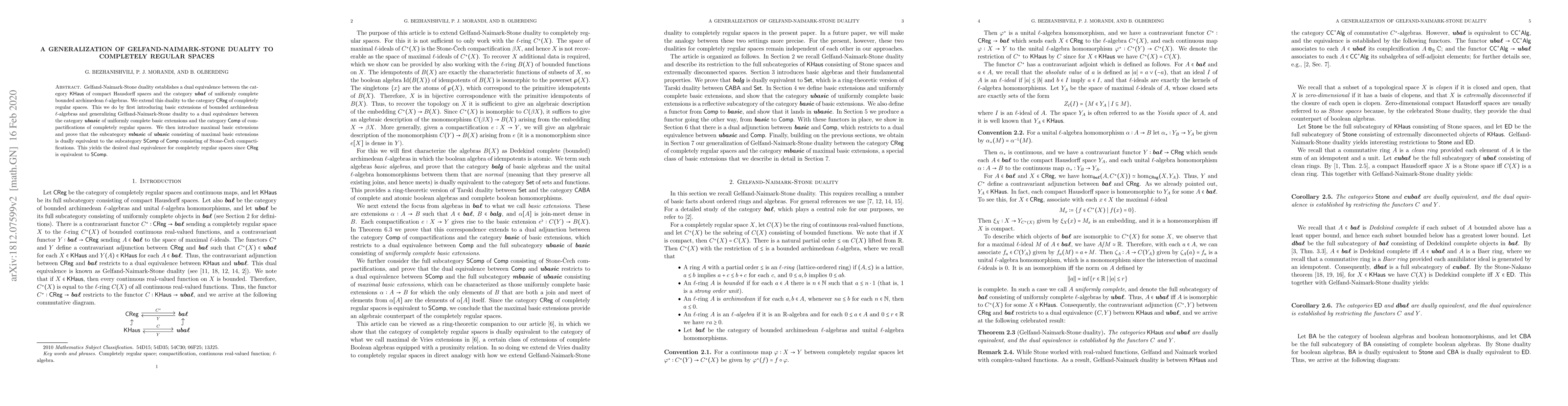 Gelfand-Naimark-Stone duality establishes a dual equivalence between the category ${\sf KHaus}$ of compact Hausdorff spaces and the category ${\boldsymbol{\mathit{uba}\ell}}$ of uniformly complete bounded archimedean $\ell$-algebras. We extend this duality to the category ${\sf CReg}$ of completely regular spaces. This we do by first introducing basic extensions of bounded archimedean $\ell$-algebras and generalizing Gelfand-Naimark-Stone duality to a dual equivalence between the category ${\boldsymbol{\mathit{ubasic}}}$ of uniformly complete basic extensions and the category ${\sf C}$ of compactifications of completely regular spaces. We then introduce maximal basic extensions and prove that the subcategory ${\boldsymbol{\mathit{mbasic}}}$ of ${\boldsymbol{\mathit{ubasic}}}$ consisting of maximal basic extensions is dually equivalent to the subcategory ${\sf SComp}$ of ${\sf Comp}$ consisting of Stone-\v{C}ech compactifications. This yields the desired dual equivalence for completely regular spaces since ${\sf CReg}$ is equivalent to ${\sf SComp}$.