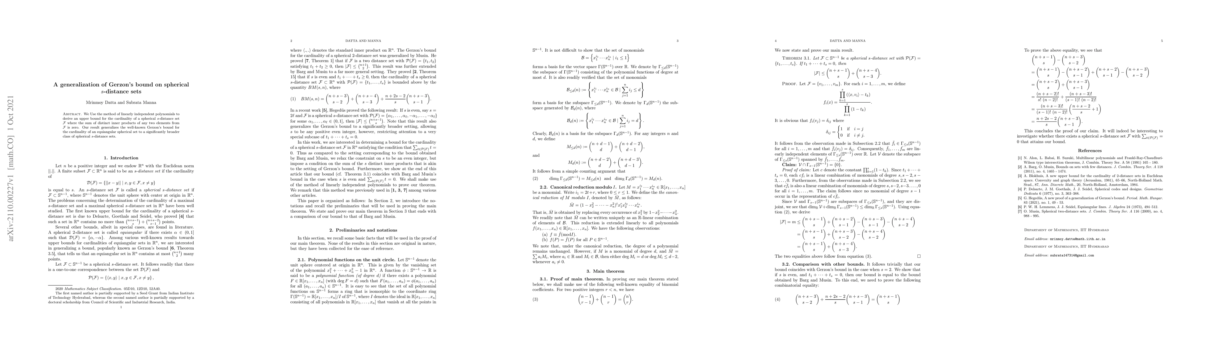 This paper derives an upper bound for the size of spherical s-distance sets using linearly independent polynomials, extending Gerzon's bound to a wider range of configurations beyond equiangular sets. The method ensures the sum of distinct inner products between any two elements is zero.