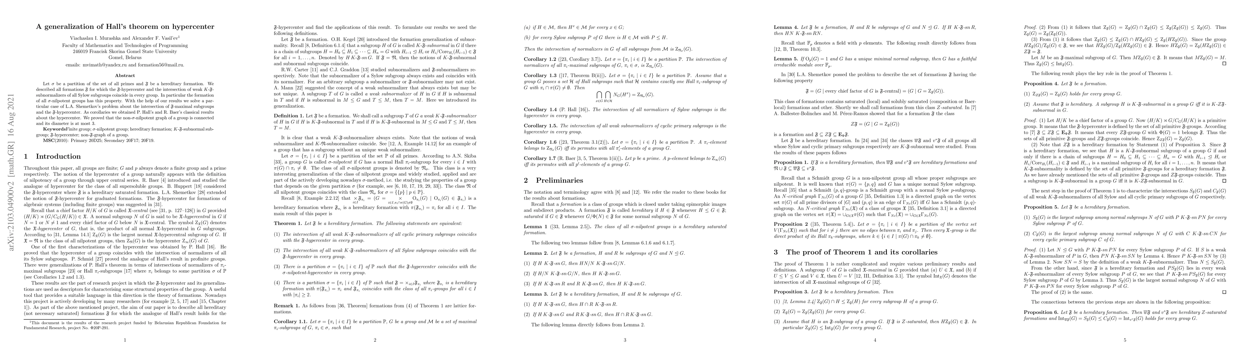 Let $ \sigma$ be a partition of the set of all primes and $\mathfrak{F}$ be a hereditary formation. We described all formations $\mathfrak{F}$ for which the $\mathfrak{F}$-hypercenter and the intersection of weak $K$-$\mathfrak{F}$-subnormalizers of all Sylow subgroups coincide in every group. In particular the formation of all $\sigma$-nilpotent groups has this property. With the help of our results we solve a particular case of L.A.~Shemetkov's problem about the intersection of $\mathfrak{F}$-maximal subgroups and the $\mathfrak{F}$-hypercenter. As corollaries we obtained P. Hall's and R. Baer's classical results about the hypercenter. We proved that the non-$\sigma$-nilpotent graph of a group is connected and its diameter is at most 3.
