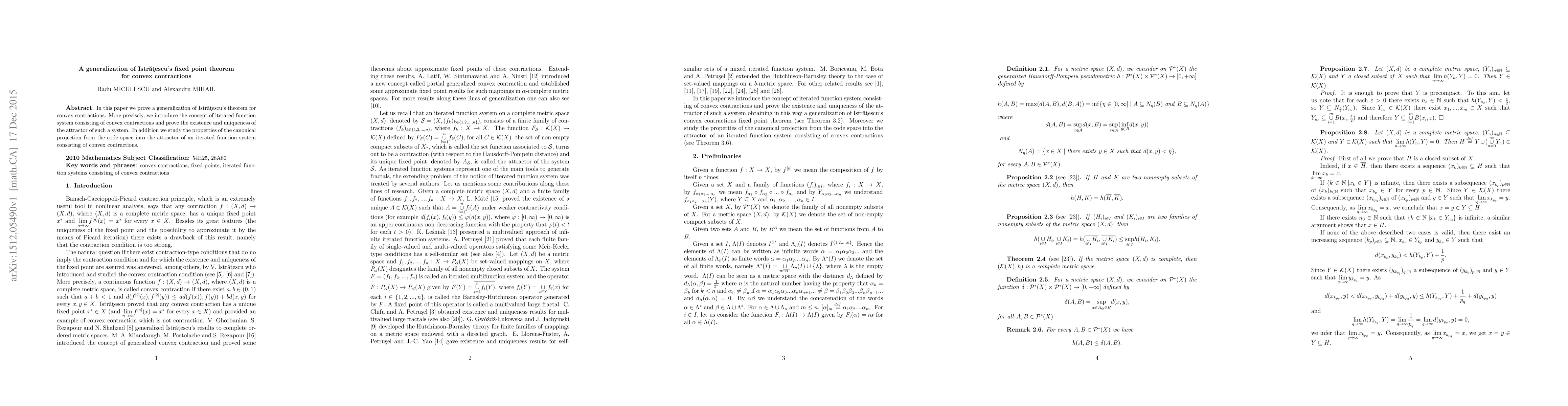 In this paper we prove a generalization of Istr\u{a}\c{t}escu's theorem for convex contractions. More precisely, we introduce the concept of iterated function system consisting of convex contractions and prove the existence and uniqueness of the attractor of such a system. In addition we study the properties of the canonical projection from the code space into the attractor of an iterated function system consisting of convex contractions.