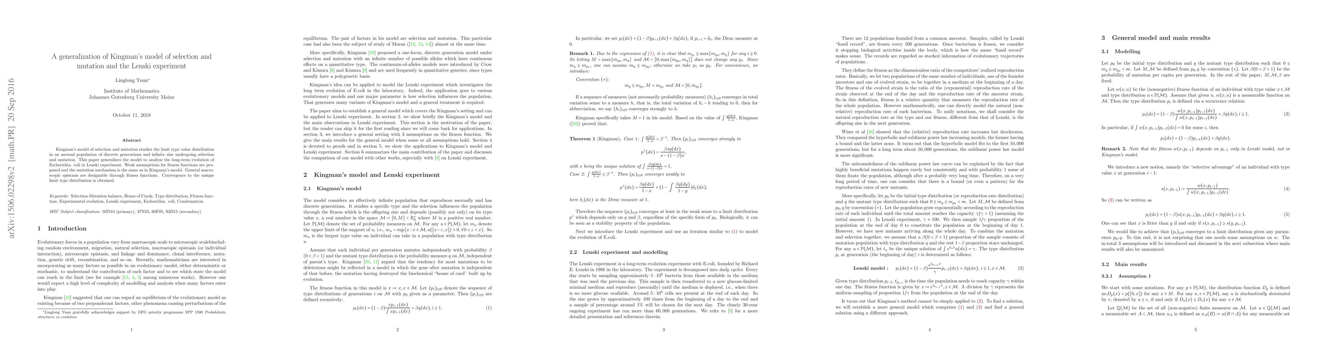 This paper generalizes Kingman's model of selection and mutation to analyze long-term evolution in Escherichia coli from the Lenski experiment, proposing weak fitness function assumptions and maintaining the original mutation mechanism. It demonstrates convergence to a unique limit type distribution through general macroscopic epistasis.