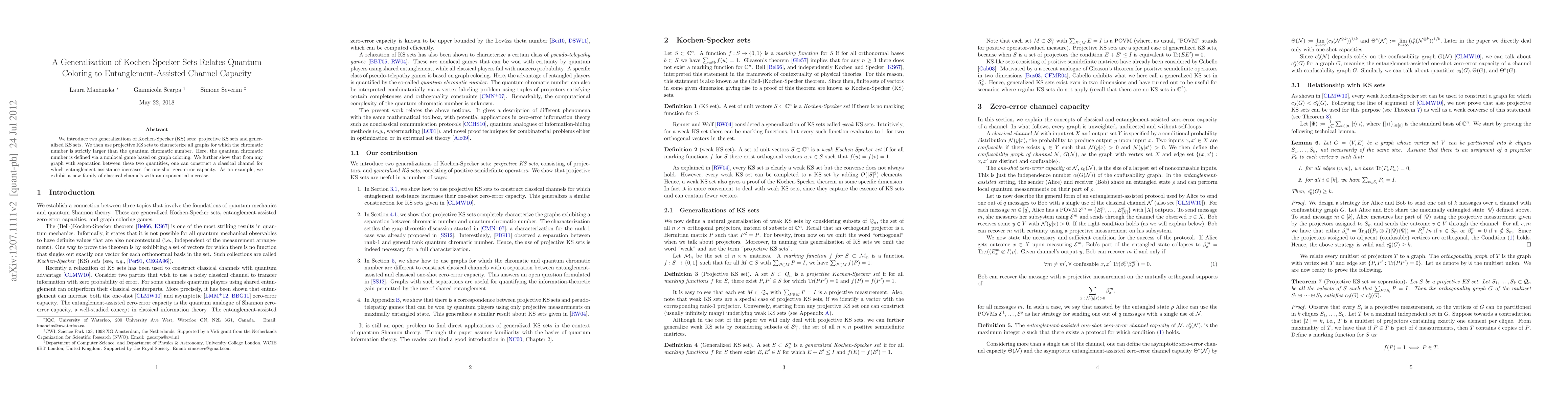 We introduce two generalizations of Kochen-Specker (KS) sets: projective KS sets and generalized KS sets. We then use projective KS sets to characterize all graphs for which the chromatic number is strictly larger than the quantum chromatic number. Here, the quantum chromatic number is defined via a nonlocal game based on graph coloring. We further show that from any graph with separation between these two quantities, one can construct a classical channel for which entanglement assistance increases the one-shot zero-error capacity. As an example, we exhibit a new family of classical channels with an exponential increase.