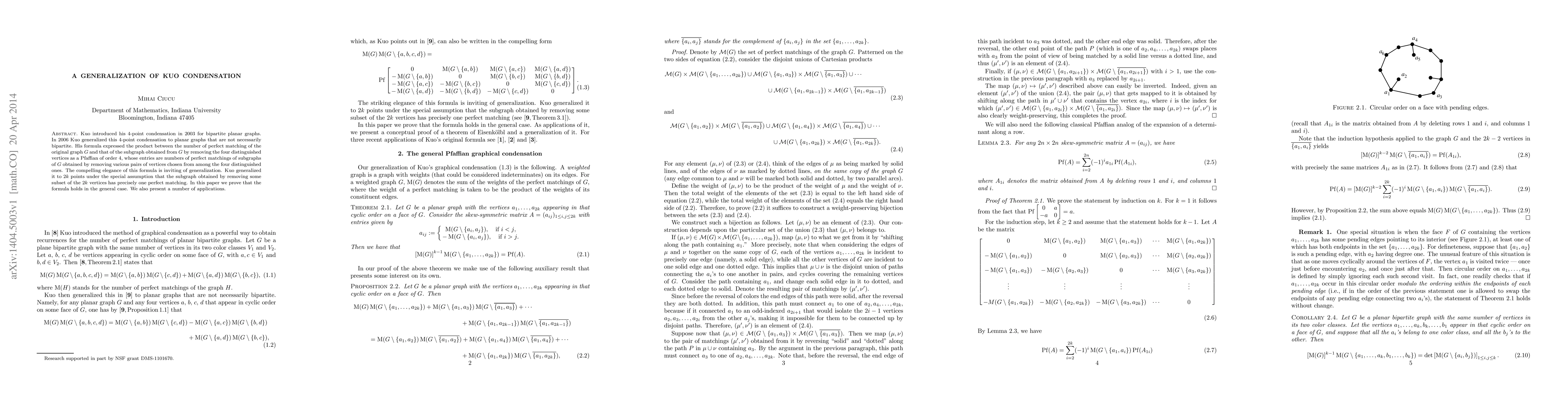 Kuo introduced his 4-point condensation in 2003 for bipartite planar graphs. In 2006 Kuo generalized this 4-point condensation to planar graphs that are not necessarily bipartite. His formula expressed the product between the number of perfect matching of the original graph $G$ and that of the subgraph obtained from $G$ by removing the four distinguished vertices as a Pfaffian of order 4, whose entries are numbers of perfect matchings of subgraphs of $G$ obtained by removing various pairs of vertices chosen from among the four distinguished ones. The compelling elegance of this formula is inviting of generalization. Kuo generalized it to $2k$ points under the special assumption that the subgraph obtained by removing some subset of the $2k$ vertices has precisely one perfect matching. In this paper we prove that the formula holds in the general case. We also present a couple of applications.