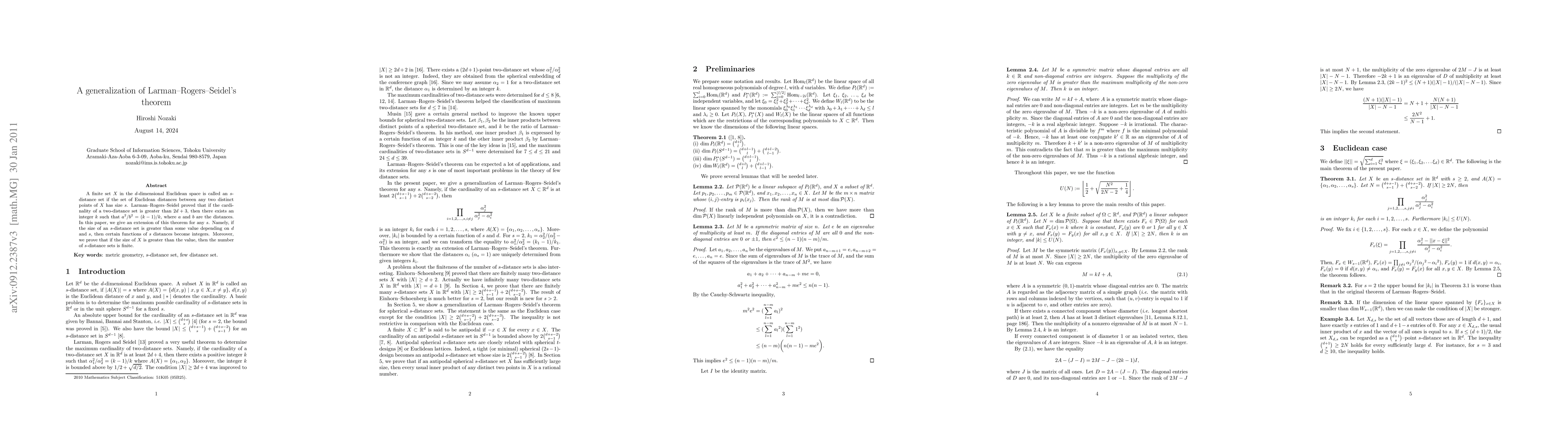 A finite set X in the d-dimensional Euclidean space is called an s-distance set if the set of Euclidean distances between any two distinct points of X has size s. Larman--Rogers--Seidel proved that if the cardinality of a two-distance set is greater than 2d+3, then there exists an integer k such that a^2/b^2=(k-1)/k, where a and b are the distances. In this paper, we give an extension of this theorem for any s. Namely, if the size of an s-distance set is greater than some value depending on d and s, then certain functions of s distances become integers. Moreover, we prove that if the size of X is greater than the value, then the number of s-distance sets is finite.