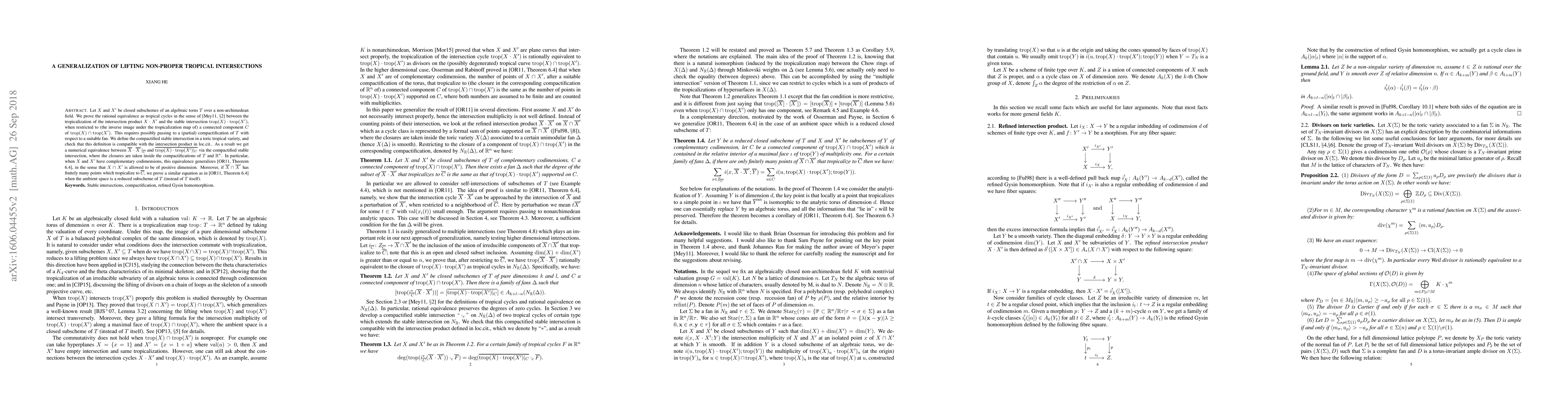 Let X and X' be closed subschemes of an algebraic torus T over a non-archimedean field. We prove the rational equivalence as tropical cycles, in the sense of Henning Meyer's graduate thesis, between the tropicalization of the intersection product of X and X' and the stable intersection of trop(X) and trop(X'), when restricted to (the inverse image under the tropicalization map of) a connected component C of the intersection of trop(X) and trop(X'). This requires possibly passing to a (partial) compactification of T with respect to a suitable fan. We define the compactified stable intersection in a toric tropical variety, and check that this definition is compatible with the intersection product in loc.cit.. As a result we get a numerical equivalence (after a compactification and restricting to C) between the intersection product of X and X' and the stable intersection of trop(X) and trop(X') via the compactified stable intersection. In particular, when X and X' have complementary codimensions, this equivalence generalizes the work of Osserman and Rabinoff, in the sense that the intersection of X and X' is allowed to be of positive dimension. Moreover, if the intersection of the closures of X and X' has finitely many points which tropicalize to the closure of C, we prove a similar equation as in Theorem 6.4 of the paper of Osserman and Rabinoff when the ambient space is a reduced closed subscheme of T (instead of T itself).