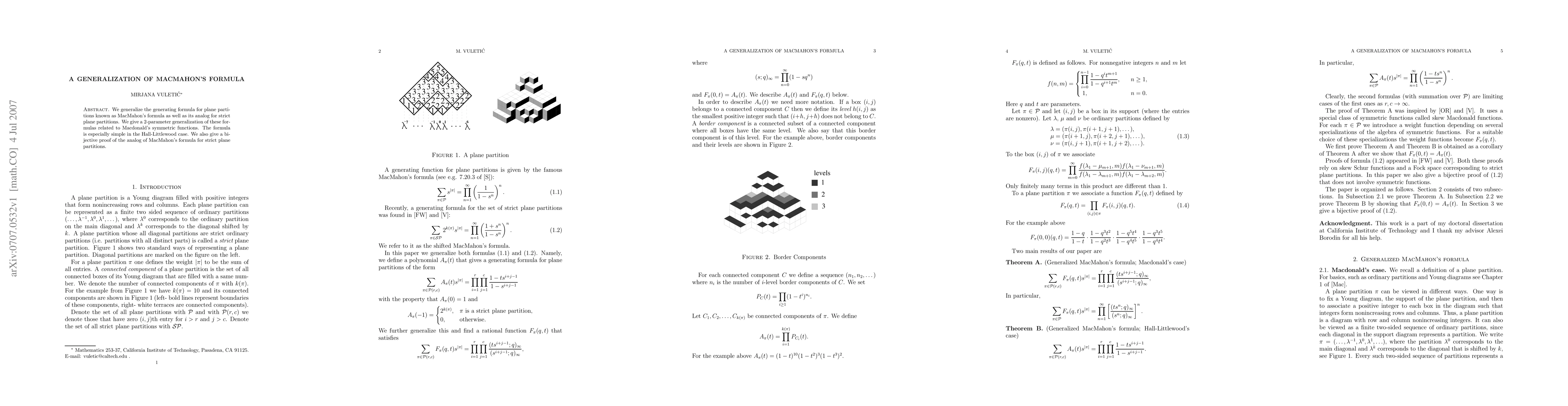 This paper generalizes MacMahon's formula for plane partitions and its strict variant, introducing a 2-parameter formula linked to Macdonald's symmetric functions, with a simplified version in the Hall-Littlewood case, and provides a bijective proof for the strict plane partition analog.