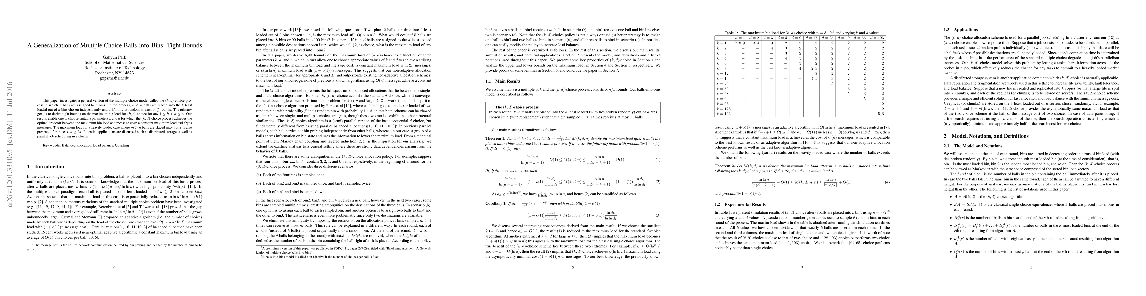 Researchers developed a generalization of the multiple choice model for distributing balls into bins, achieving a tight tradeoff between maximum bin load and message cost. Suitable parameters can be chosen to achieve an optimal balance between these factors, with implications for applications like distributed storage and parallel job scheduling.