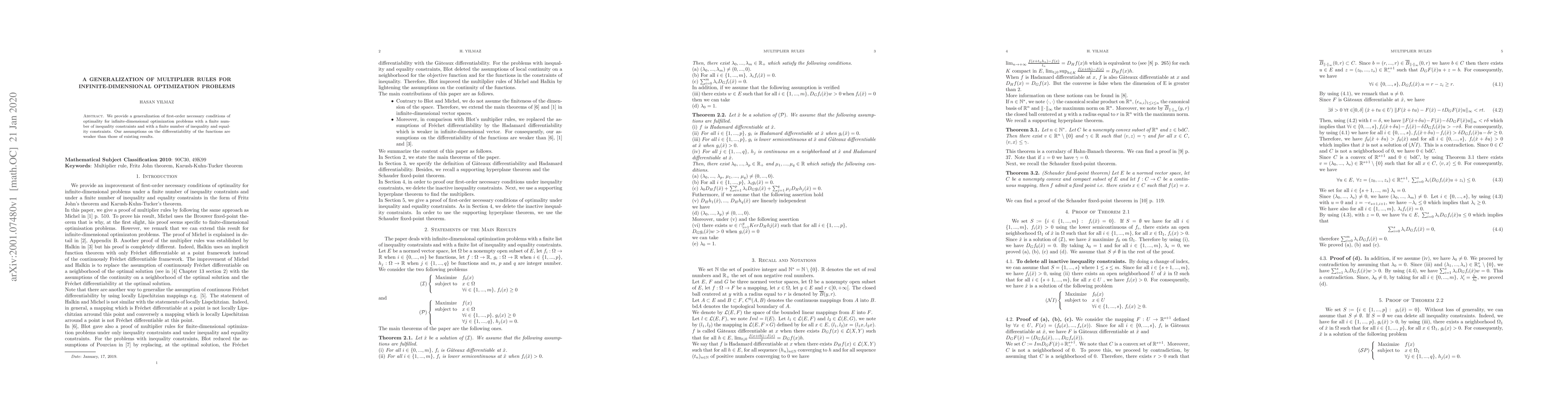 We provide a generalization of first-order necessary conditions of optimality for infinite-dimensional optimization problems with a finite number of inequality constraints and with a finite number of inequality and equality constraints. Our assumptions on the differentiability of the functions are weaker than those of existing results.