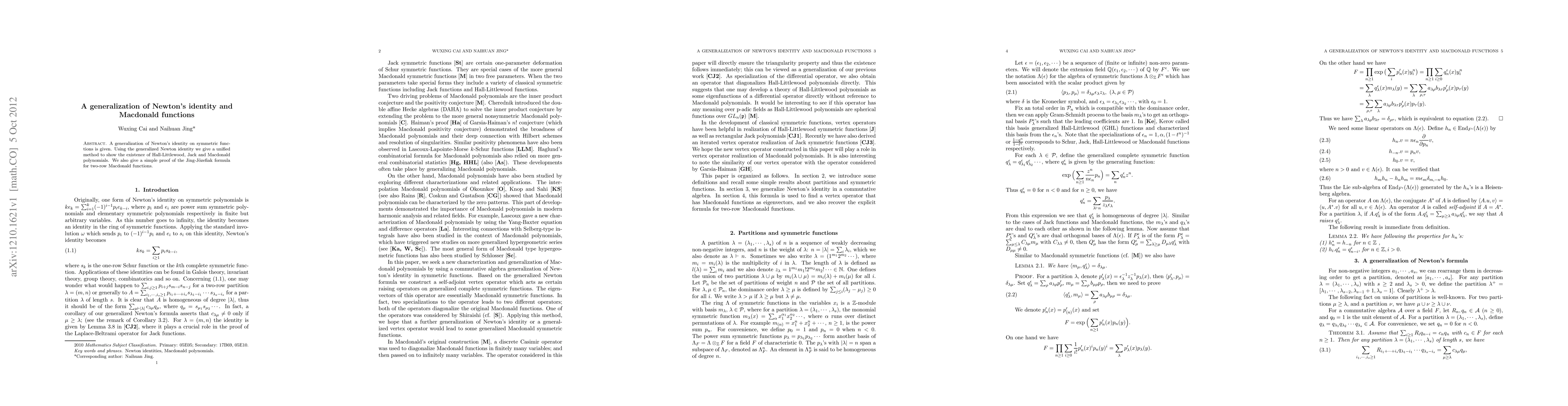 A generalization of Newton's identity on symmetric functions is given. Using the generalized Newton identity we give a unified method to show the existence of Hall-Littlewood, Jack and Macdonald polynomials. We also give a simple proof of the Jing-J\"ozefiak formula for two-row Macdonald functions.