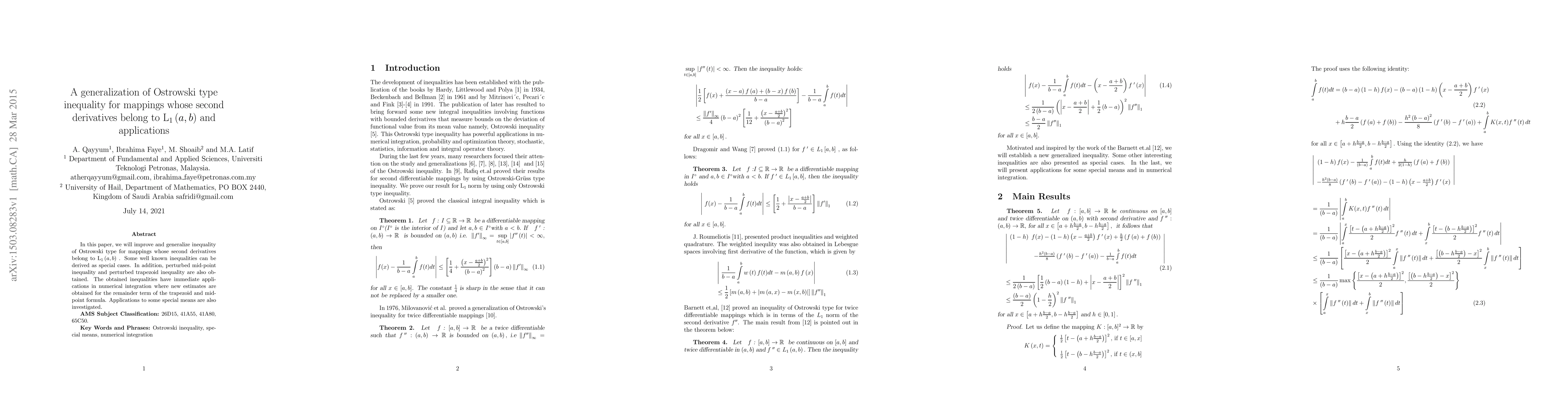 In this paper, we will improve and generalize inequality of Ostrowski type for mappings whose second derivatives belong to L$_{1}\left(a,b\right) $ . Some well known inequalities can be derived as special cases. In addition, perturbed mid-point inequality and perturbed trapezoid inequality are also obtained. The obtained inequalities have immediate applications in numerical integration where new estimates are obtained for the remainder term of the trapezoid and midpoint formula. Applications to some special means are also investigated.