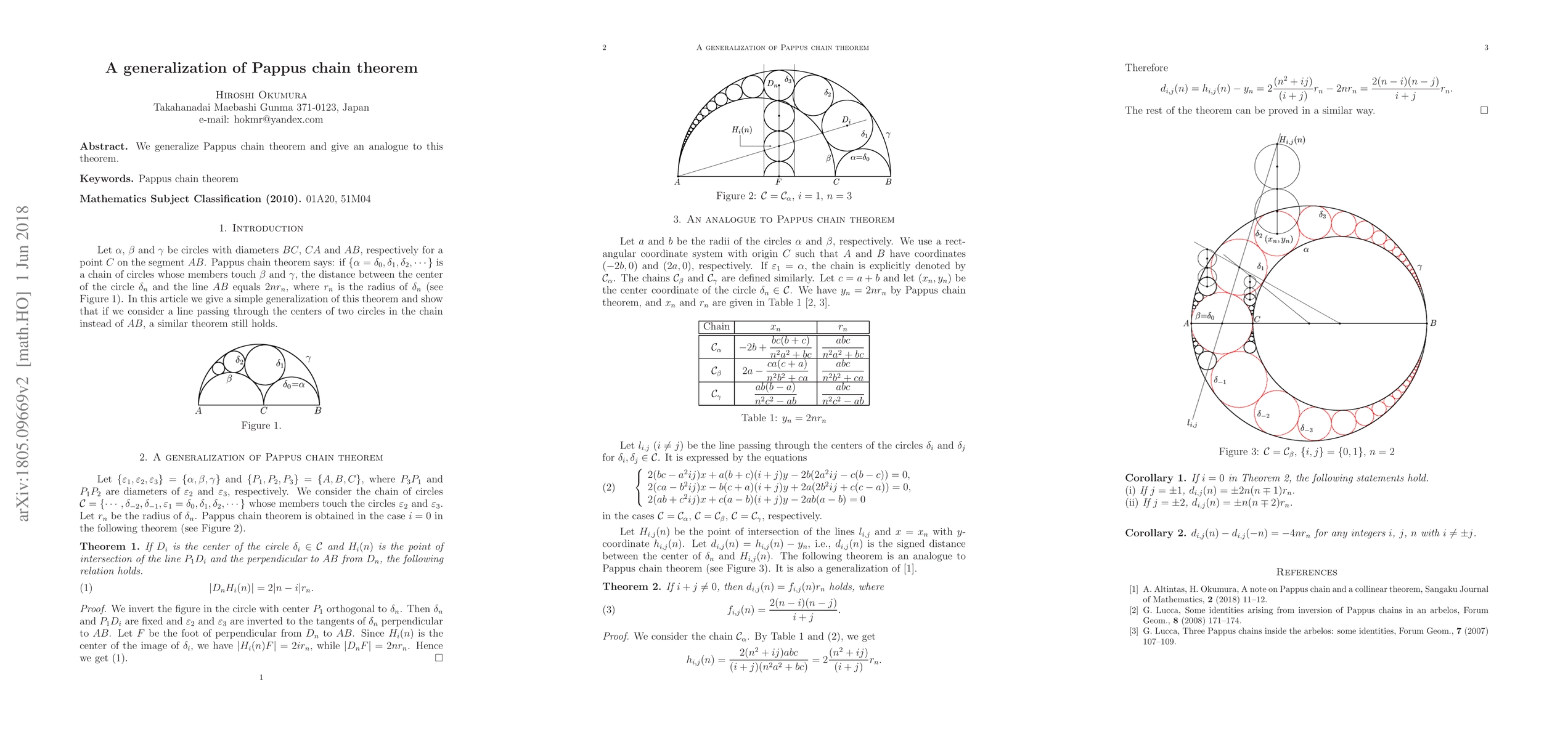 Summary: This paper presents a generalization of Pappus chain theorem, establishing an analogous result that extends the original theorem's applicability in new mathematical contexts.