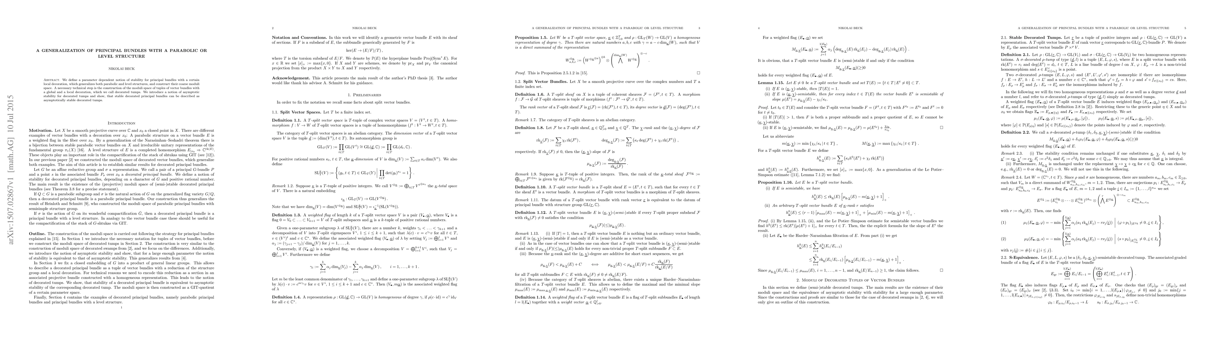 The paper generalizes the concept of stability in principal bundles with parabolic or level structures, defining a parameter-dependent stability notion and constructing their coarse moduli space. It also introduces the concept of decorated tumps, showing that stable decorated principal bundles correspond to asymptotically stable decorated tumps.