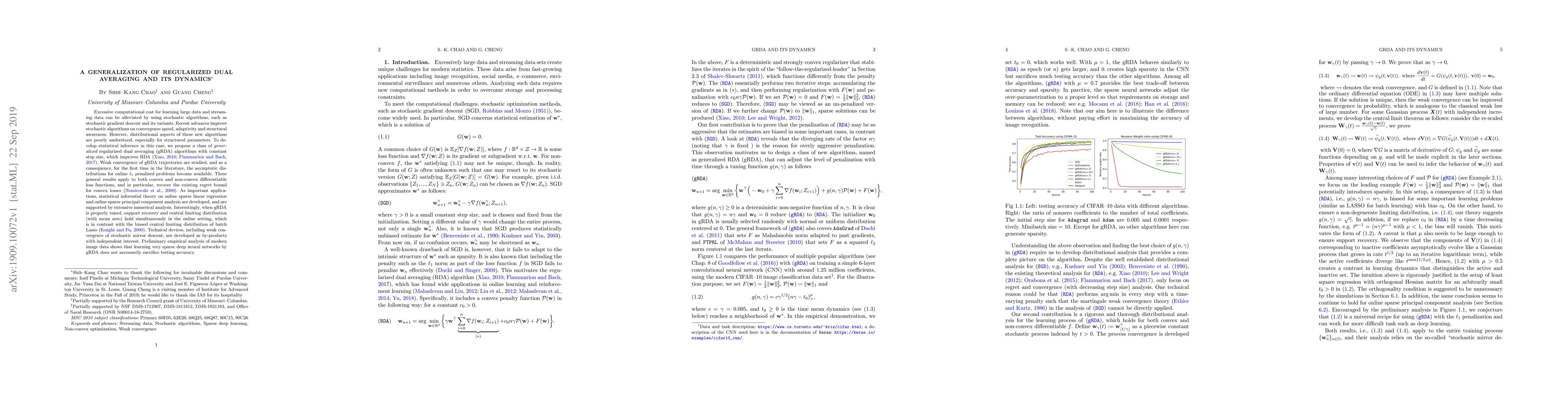 Excessive computational cost for learning large data and streaming data can be alleviated by using stochastic algorithms, such as stochastic gradient descent and its variants. Recent advances improve stochastic algorithms on convergence speed, adaptivity and structural awareness. However, distributional aspects of these new algorithms are poorly understood, especially for structured parameters. To develop statistical inference in this case, we propose a class of generalized regularized dual averaging (gRDA) algorithms with constant step size, which improves RDA (Xiao, 2010; Flammarion and Bach, 2017). Weak convergence of gRDA trajectories are studied, and as a consequence, for the first time in the literature, the asymptotic distributions for online l1 penalized problems become available. These general results apply to both convex and non-convex differentiable loss functions, and in particular, recover the existing regret bound for convex losses (Nemirovski et al., 2009). As important applications, statistical inferential theory on online sparse linear regression and online sparse principal component analysis are developed, and are supported by extensive numerical analysis. Interestingly, when gRDA is properly tuned, support recovery and central limiting distribution (with mean zero) hold simultaneously in the online setting, which is in contrast with the biased central limiting distribution of batch Lasso (Knight and Fu, 2000). Technical devices, including weak convergence of stochastic mirror descent, are developed as by-products with independent interest. Preliminary empirical analysis of modern image data shows that learning very sparse deep neural networks by gRDA does not necessarily sacrifice testing accuracy.