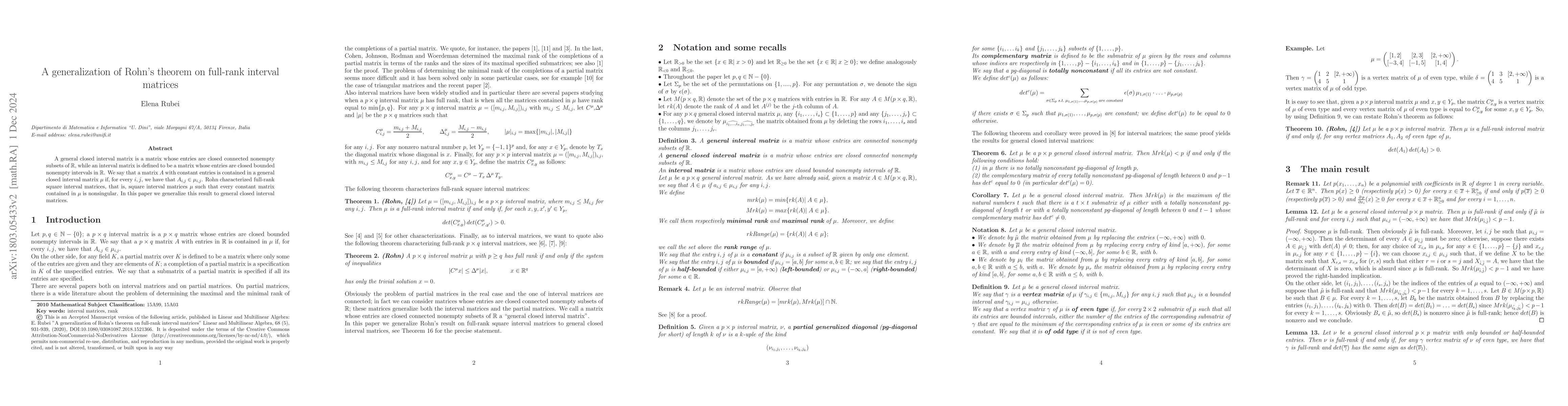 A general closed interval matrix is a matrix whose entries are closed connected nonempty subsets of the set of the real numbers, while an interval matrix is defined to be a matrix whose entries are closed bounded nonempty intervals in the set of real numbers. We say that a matrix $A$ with constant entries is contained in a general closed interval matrix $\mu$ if and only if, for every $i,j$, we have that $A_{i,j} \in \mu_{i,j}$. Rhon characterized full-rank square interval matrices, that is, square interval matrices $\mu$ such that every constant matrix contained in $\mu$ is nonsingular. In this paper we generalize this result to general closed interval matrices.