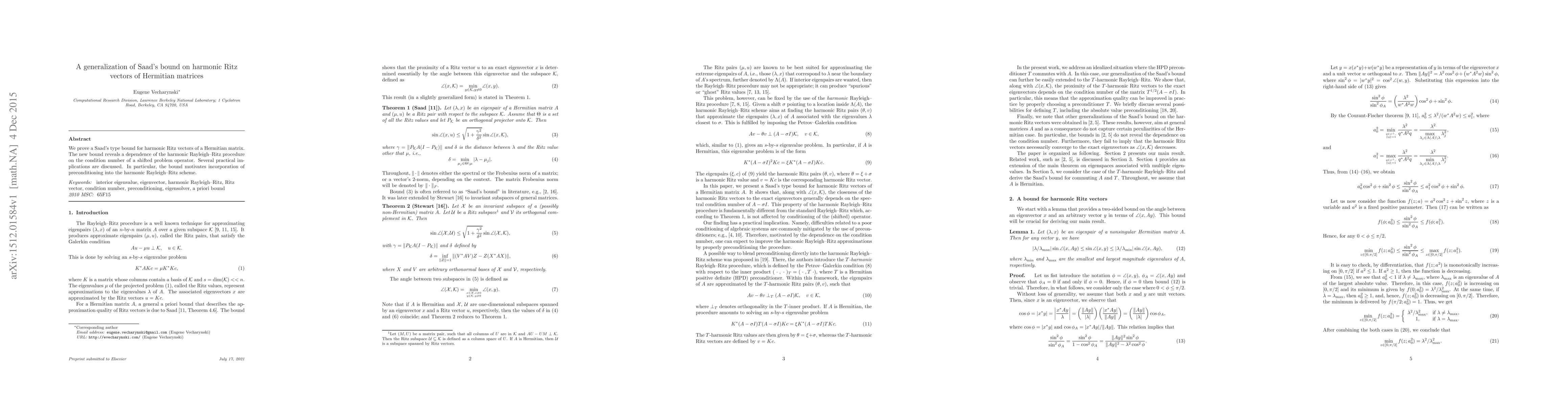 This paper generalizes Saad's bound on harmonic Ritz vectors for Hermitian matrices, providing a new bound that depends on the condition number of a shifted problem operator. The implications include potential benefits from preconditioning in the harmonic Rayleigh-Ritz procedure.
