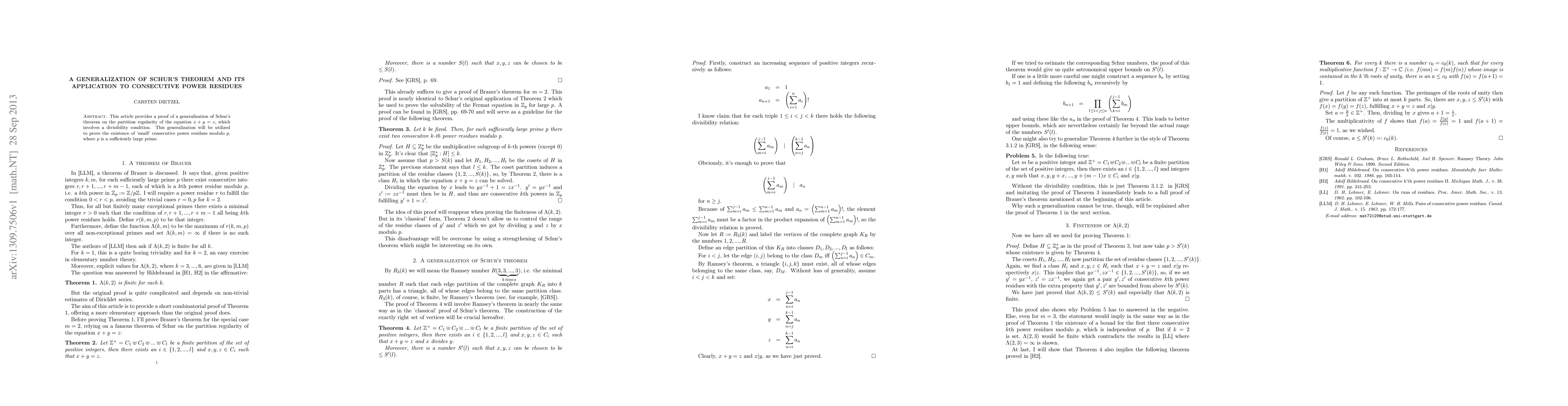 This article provides a proof of a generalization of Schur's theorem on the partition regularity of the equation x+y=z, which involves a divisibility condition. This generalization will be utilized to prove the existence of 'small' consecutive power residues modulo p, where p is a sufficiently large prime.