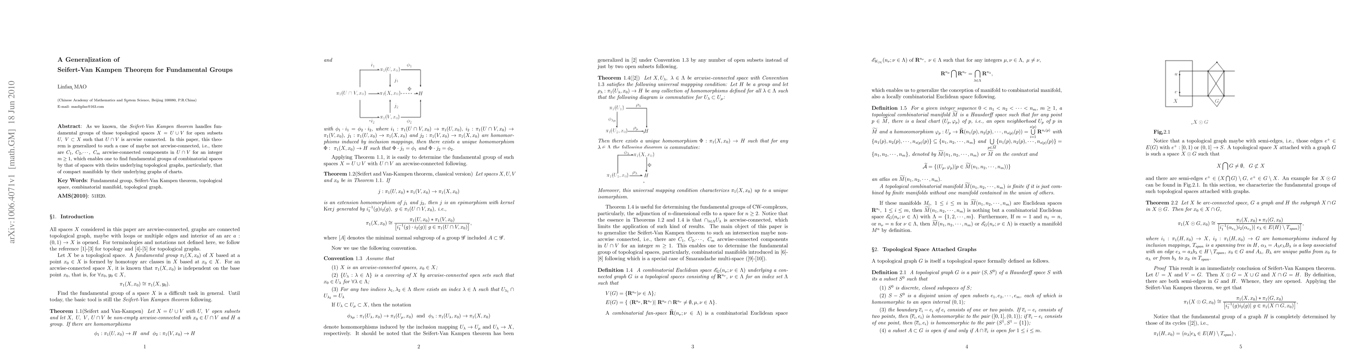 As we known, the {\it Seifert-Van Kampen theorem} handles fundamental groups of those topological spaces $X=U\cup V$ for open subsets $U, V\subset X$ such that $U\cap V$ is arcwise connected. In this paper, this theorem is generalized to such a case of maybe not arcwise-connected, i.e., there are $C_1$, $C_2$,$..., C_m$ arcwise-connected components in $U\cap V$ for an integer $m\geq 1$, which enables one to find fundamental groups of combinatorial spaces by that of spaces with theirs underlying topological graphs, particularly, that of compact manifolds by their underlying graphs of charts.