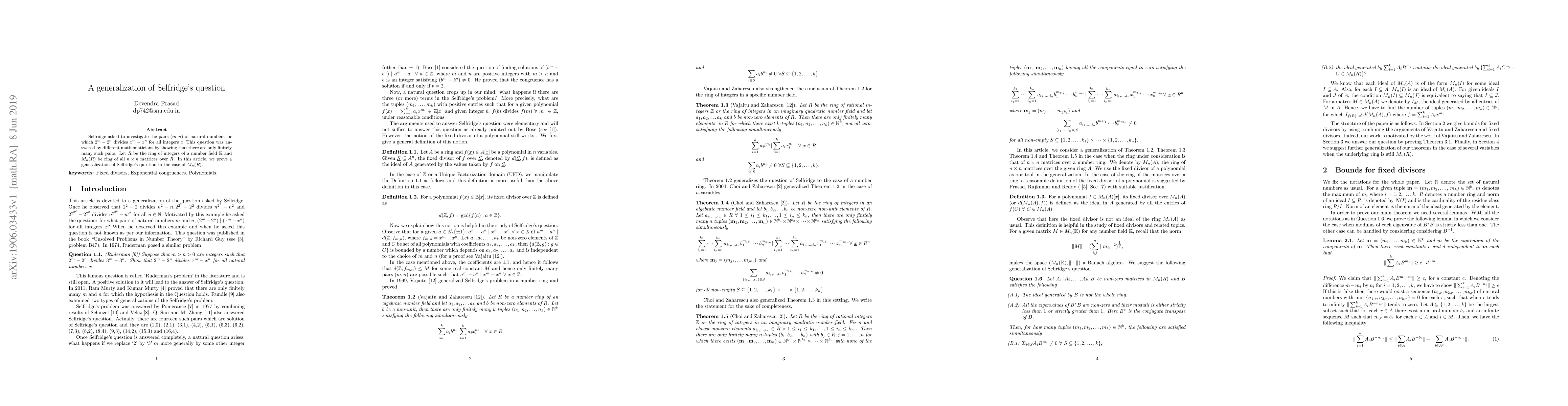 Selfridge asked to investigate the pairs $(m,n)$ of natural numbers for which $2^m - 2^n$ divides $x^m - x^n$ for all integers $x.$ This question was answered by different mathematicians by showing that there are only finitely many such pairs. Let $R$ be the ring of integers of a number field $\K$ and $M_n(R)$ be ring of all $n \times n$ matrices over $R$. In this article, we prove a generalization of Selfridge's question in the case of $M_n(R)$.