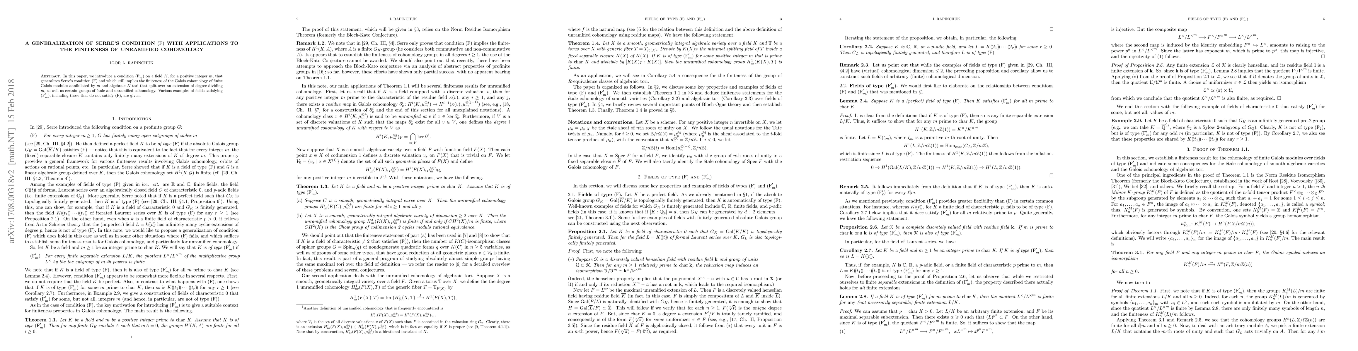 This paper generalizes Serre's condition (F) to a new condition (F'_m) for fields, which ensures the finiteness of Galois cohomology for certain modules and algebraic tori, along with applications to unramified cohomology. Examples of fields meeting the new condition, even if they do not satisfy the original (F), are provided.