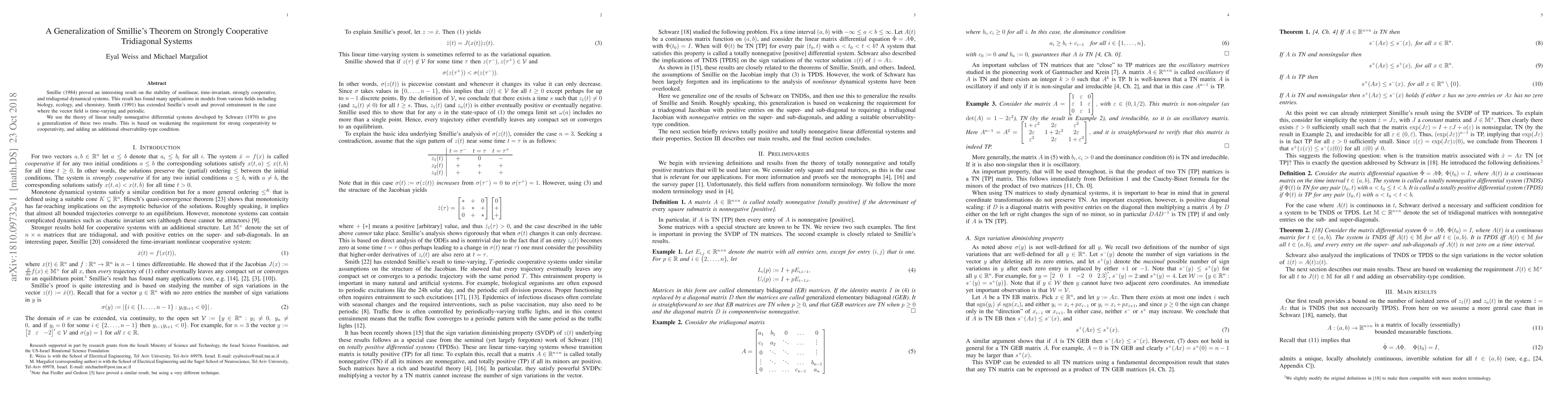 Smillie (1984) proved an interesting result on the stability of nonlinear, time-invariant, strongly cooperative, and tridiagonal dynamical systems. This result has found many applications in models from various fields including biology, ecology, and chemistry. Smith (1991) has extended Smillie's result and proved entrainment in the case where the vector field is time-varying and periodic. We use the theory of linear totally nonnegative differential systems developed by Schwarz (1970) to give a generalization of these two results. This is based on weakening the requirement for strong cooperativity to cooperativity, and adding an additional observability-type condition.
