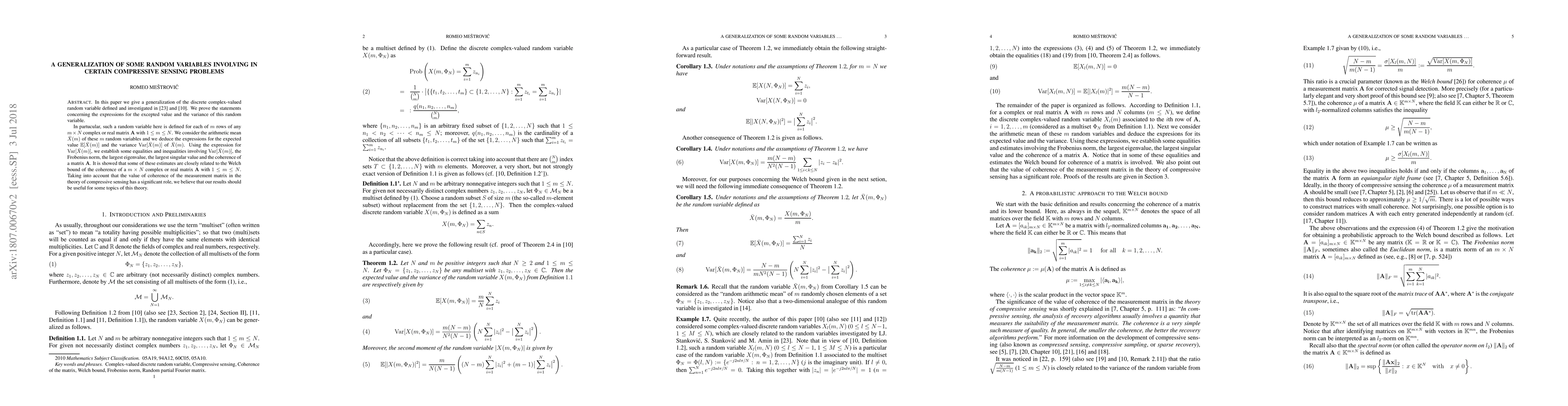 Researchers generalized a random variable used in compressive sensing problems, deriving expressions for its expected value and variance. They also established relationships between these quantities and other metrics of the matrix involved.
