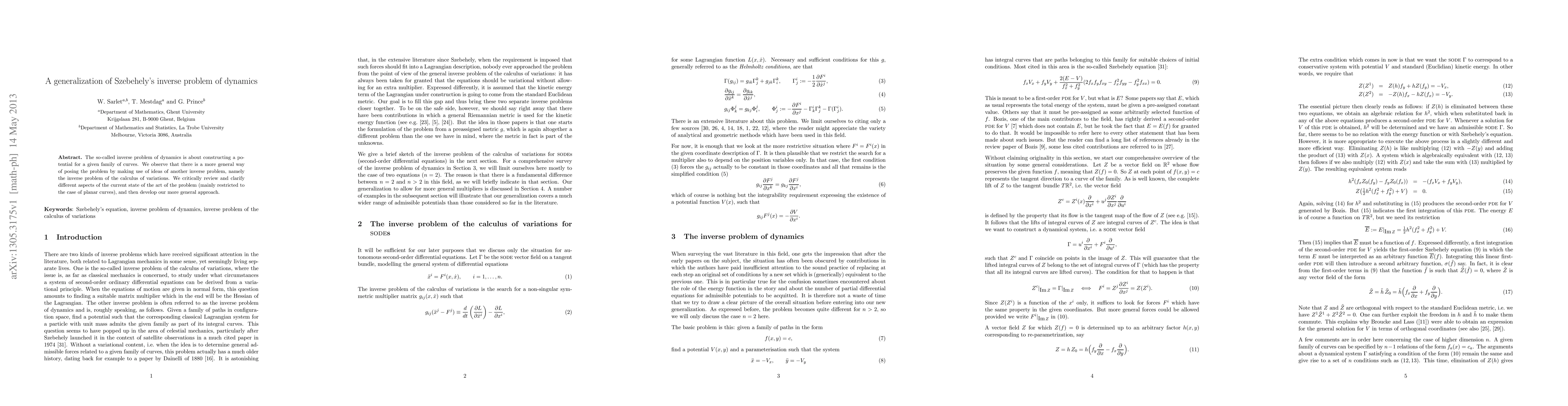 The so-called inverse problem of dynamics is about constructing a potential for a given family of curves. We observe that there is a more general way of posing the problem by making use of ideas of another inverse problem, namely the inverse problem of the calculus of variations. We critically review and clarify different aspects of the current state of the art of the problem (mainly restricted to the case of planar curves), and then develop our more general approach.