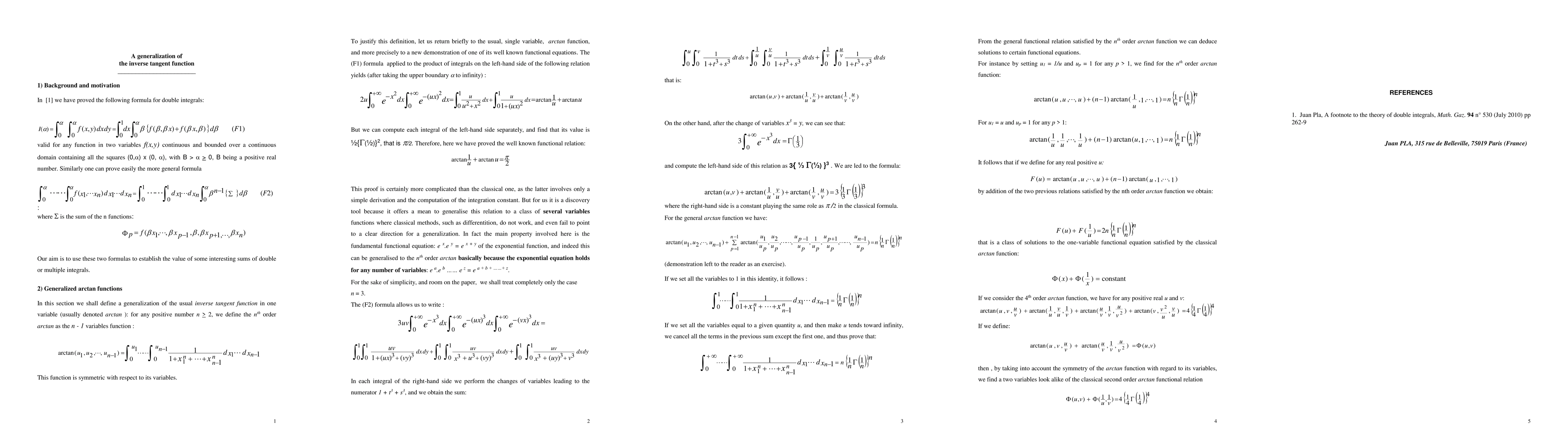 In this paper we define a family of continuous functions of an arbitrary number of variables, and prove that they all satisfy a generalization of one of the classical functional equations of the inverse tangent function.