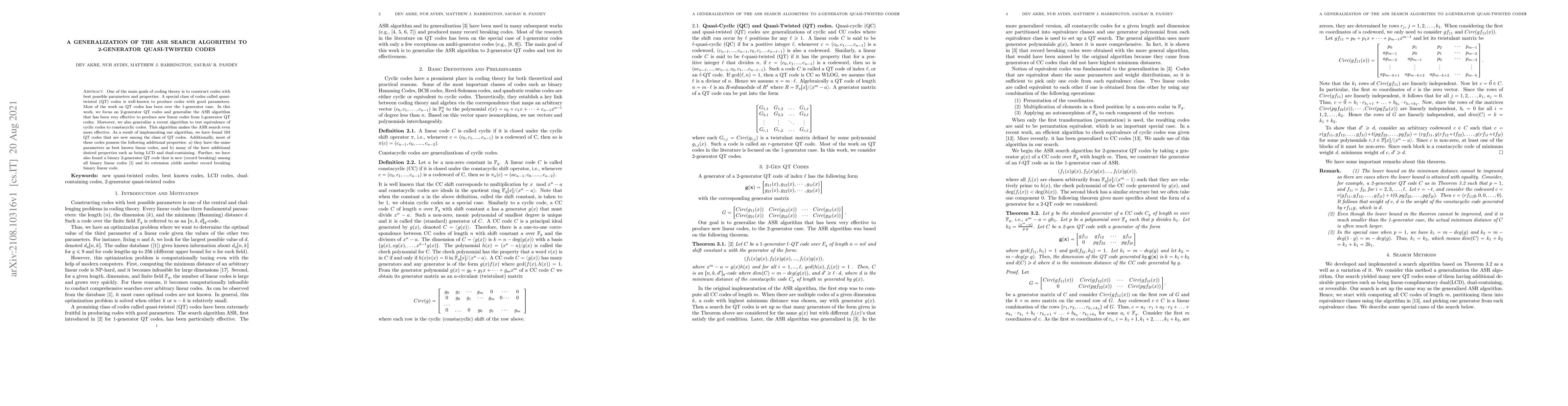 One of the main goals of coding theory is to construct codes with best possible parameters and properties. A special class of codes called quasi-twisted (QT) codes is well-known to produce codes with good parameters. Most of the work on QT codes has been over the 1-generator case. In this work, we focus on 2-generator QT codes and generalize the ASR algorithm that has been very effective to produce new linear codes from 1-generator QT codes. Moreover, we also generalize a recent algorithm to test equivalence of cyclic codes to constacyclic codes. This algorithm makes the ASR search even more effective. As a result of implementing our algorithm, we have found 103 QT codes that are new among the class of QT codes. Additionally, most of these codes possess the following additional properties: a) they have the same parameters as best known linear codes, and b) many of the have additional desired properties such as being LCD and dual-containing. Further, we have also found a binary 2-generator QT code that is new (record breaking) among all binary linear codes and its extension yields another record breaking binary linear code.
