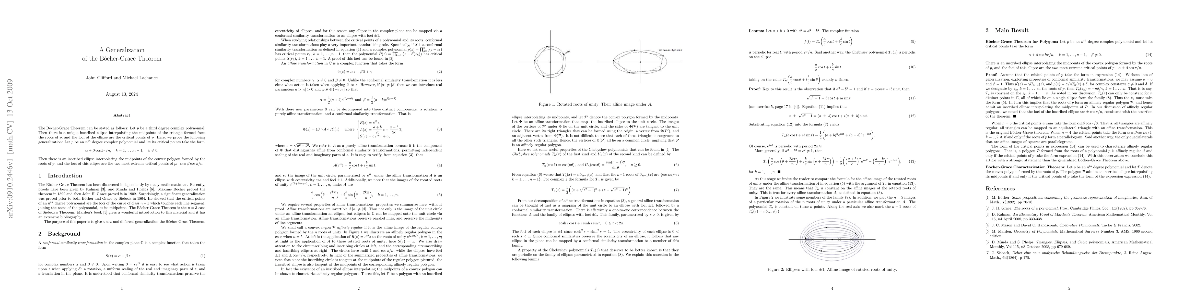 The B\^{o}cher-Grace Theorem can be stated as follows: Let $p$ be a third degree complex polynomial. Then there is a unique inscribed ellipse interpolating the midpoints of the triangle formed from the roots of $p$, and the foci of the ellipse are the critical points of $p$. Here, we prove the following generalization: Let $p$ be an $n^{th}$ degree complex polynomial and let its critical points take the form $$ \alpha+\beta \cos k\pi/n, \quad k=1,...,n-1, \quad\beta\ne0. $$ Then there is an inscribed ellipse interpolating the midpoints of the convex polygon formed by the roots of $p$, and the foci of this ellipse are the two most extreme critical points of $p$: $\alpha\pm\beta \cos \pi/n$.
