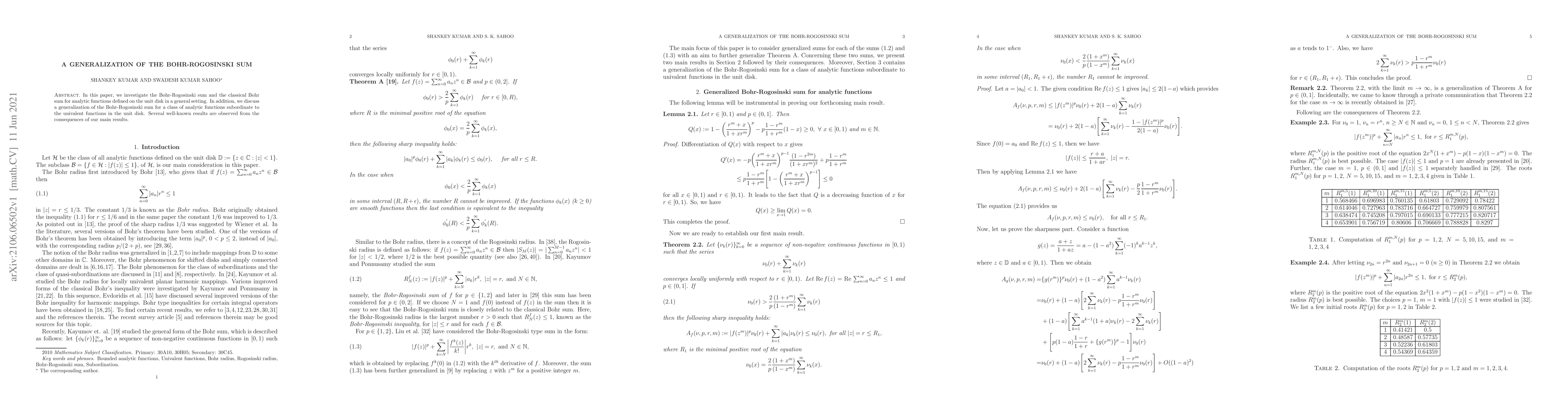 In this paper, we investigate the Bohr-Rogosinski sum and the classical Bohr sum for analytic functions defined on the unit disk in a general setting. In addition, we discuss a generalization of the Bohr-Rogosinski sum for a class of analytic functions subordinate to the univalent functions in the unit disk. Several well-known results are observed from the consequences of our main results.