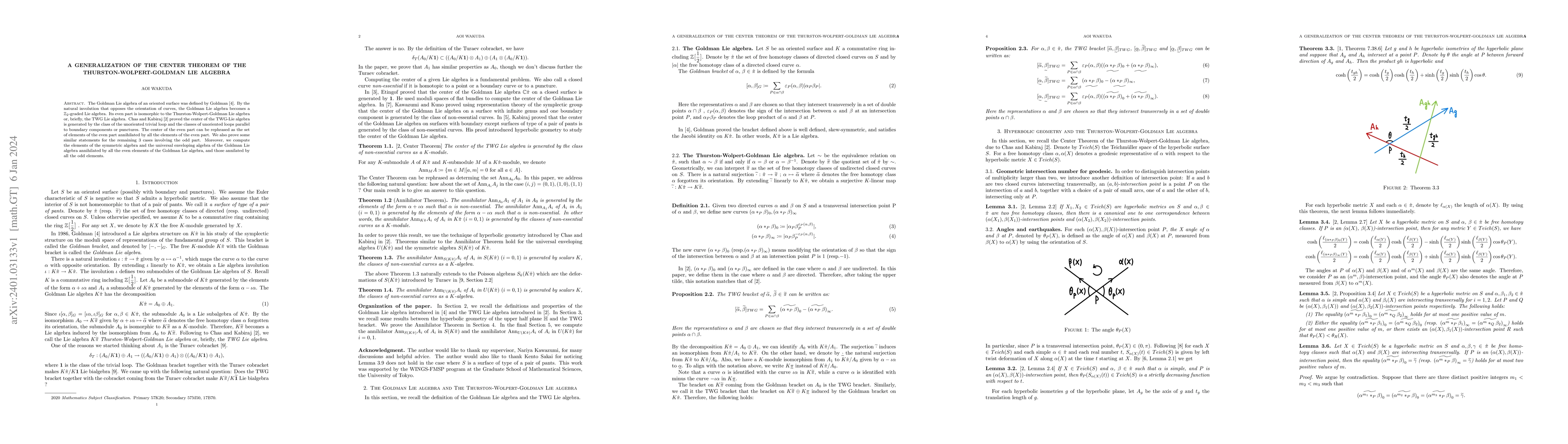 This paper generalizes the Center Theorem for the Thurston-Wolpert-Goldman (TWG) Lie algebra by examining the Goldman Lie algebra and its $\mathbb{Z}_{2}$-graded structure. It proves the center of the even part and extends similar results to the odd part, while also computing specific elements in the symmetric and universal enveloping algebras of the Goldman Lie algebra.