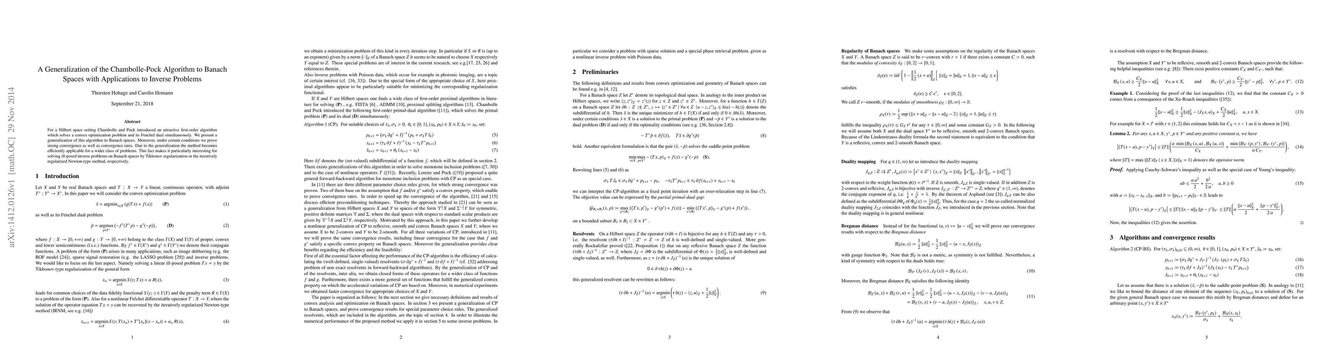 For a Hilbert space setting Chambolle and Pock introduced an attractive first-order algorithm which solves a convex optimization problem and its Fenchel dual simultaneously. We present a generalization of this algorithm to Banach spaces. Moreover, under certain conditions we prove strong convergence as well as convergence rates. Due to the generalization the method becomes efficiently applicable for a wider class of problems. This fact makes it particularly interesting for solving ill-posed inverse problems on Banach spaces by Tikhonov regularization or the iteratively regularized Newton-type method, respectively.